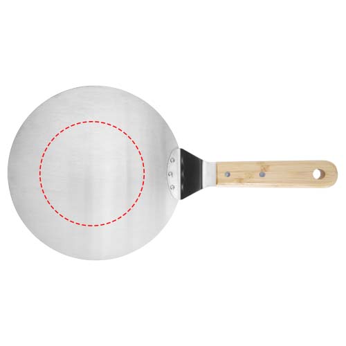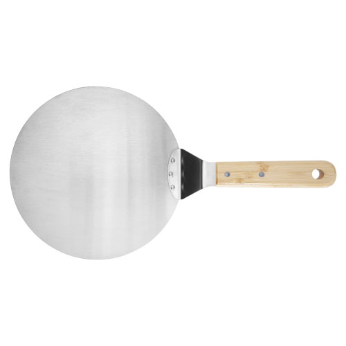 Mit diesem dünnen Pizzaschieber aus Metall können Sie Ihre Pizza oder sogar Ihren Kuchen ganz einfach aus dem Ofen auf den Teller holen. Handgriff aus Bambus, der nach nachhaltigen Normen bezogen und produziert wird.