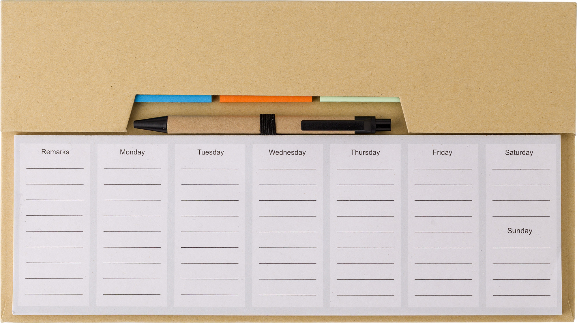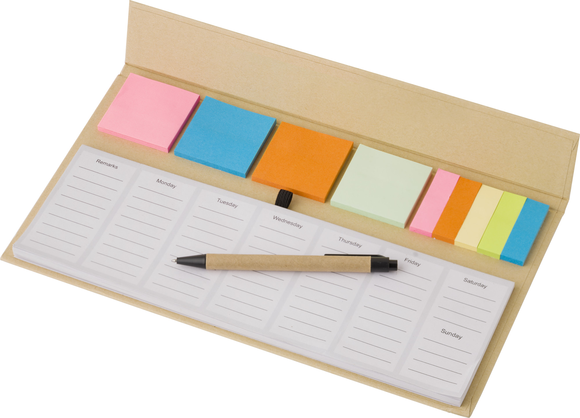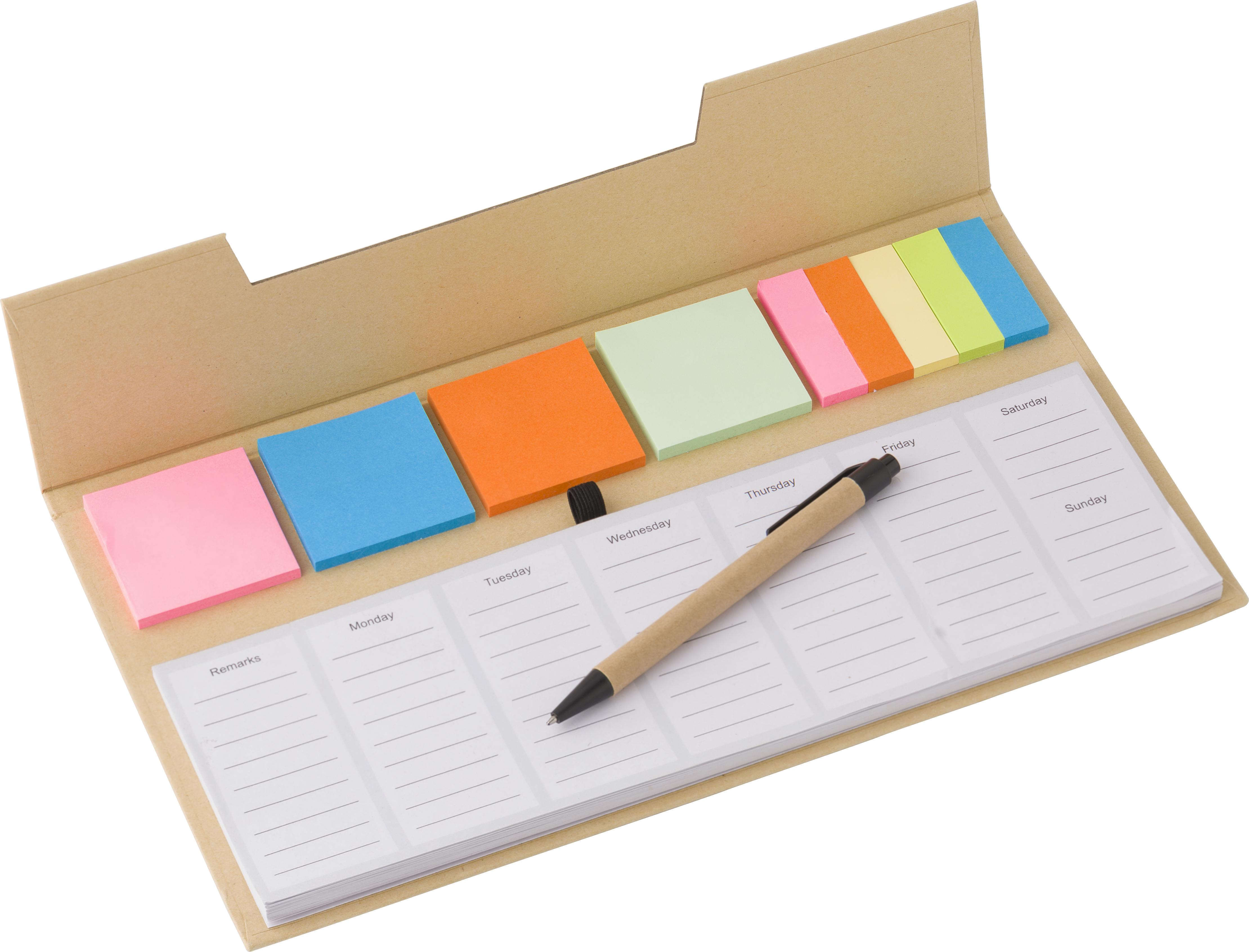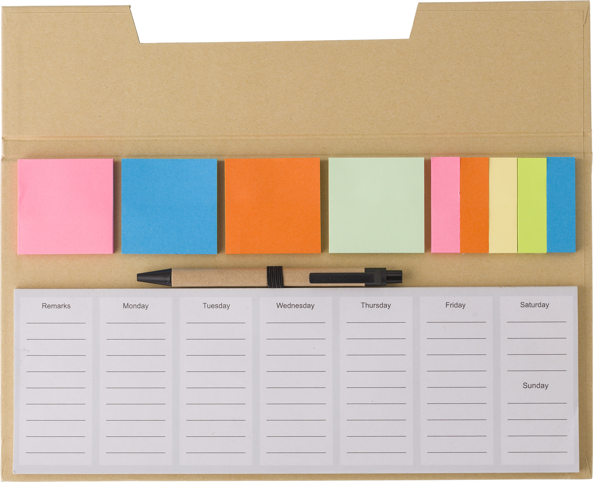 Papier-Memo-Set mit Notizblock, Haftnotizen, Karton und Kunststoffstift. 50 Blatt pro Memo-Farbe. Die ersten fünf Seiten des Notizblocks sind mit einem Wochenplaner bedruckt, die anderen Seiten sind leer.