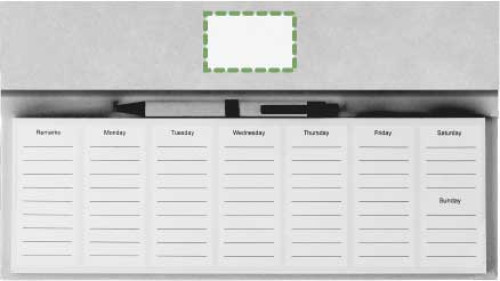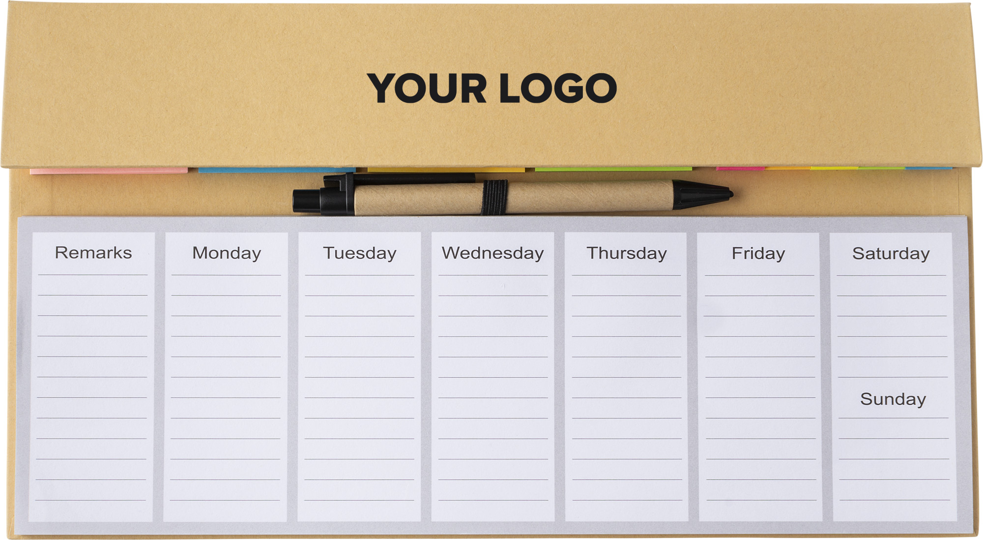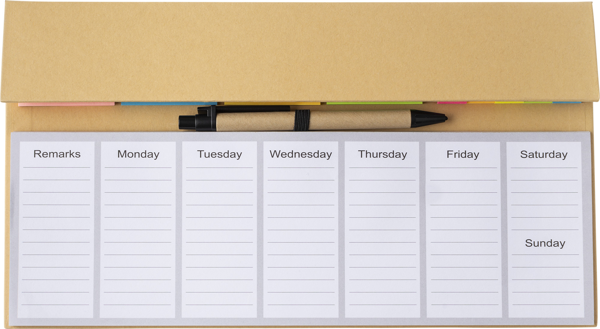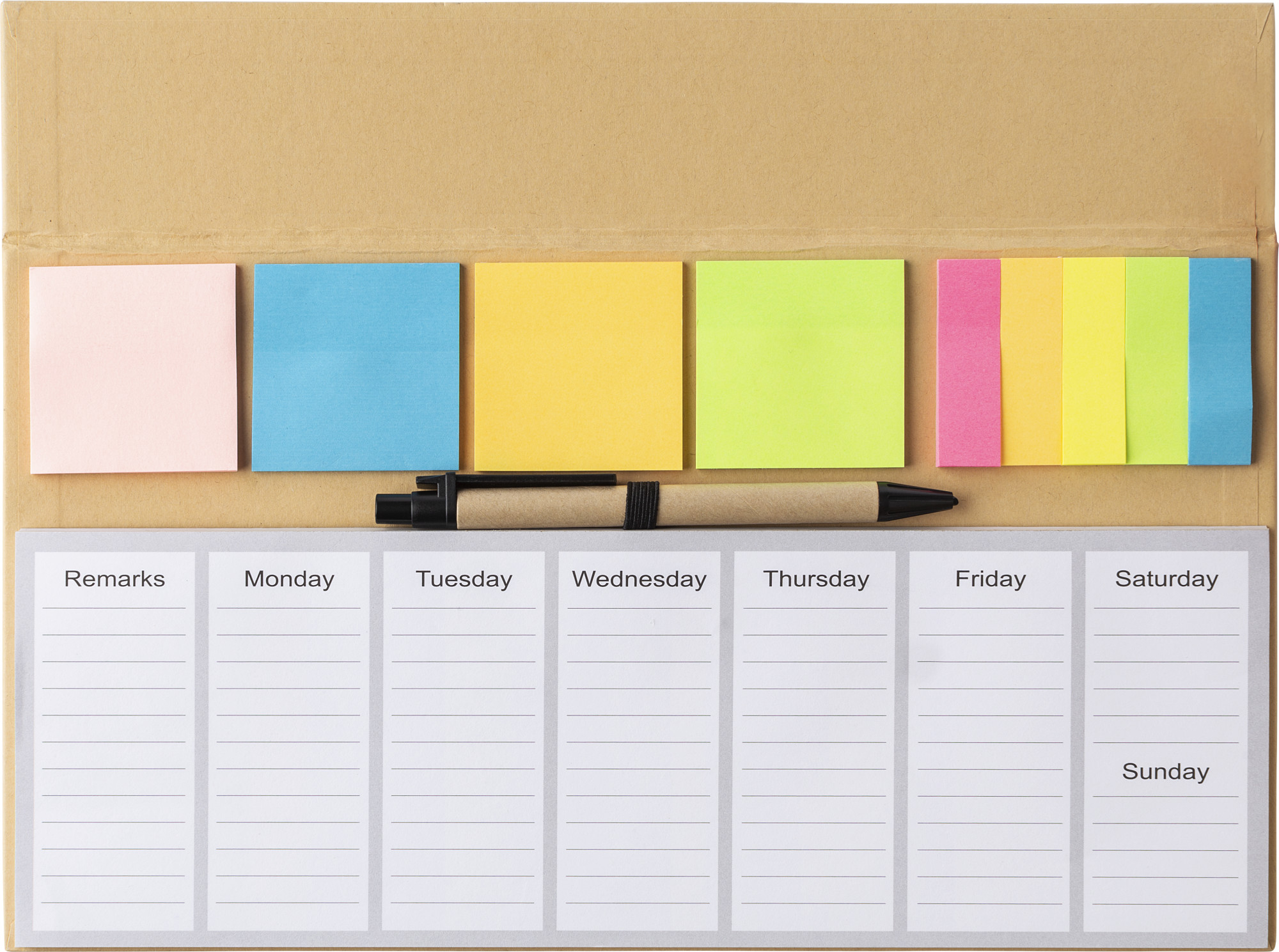 Papier-Memo-Set mit Notizblock, Haftnotizen, Karton und Kunststoffstift. 50 Blatt pro Memo-Farbe. Die ersten fünf Seiten des Notizblocks sind mit einem Wochenplaner bedruckt, die anderen Seiten sind leer.