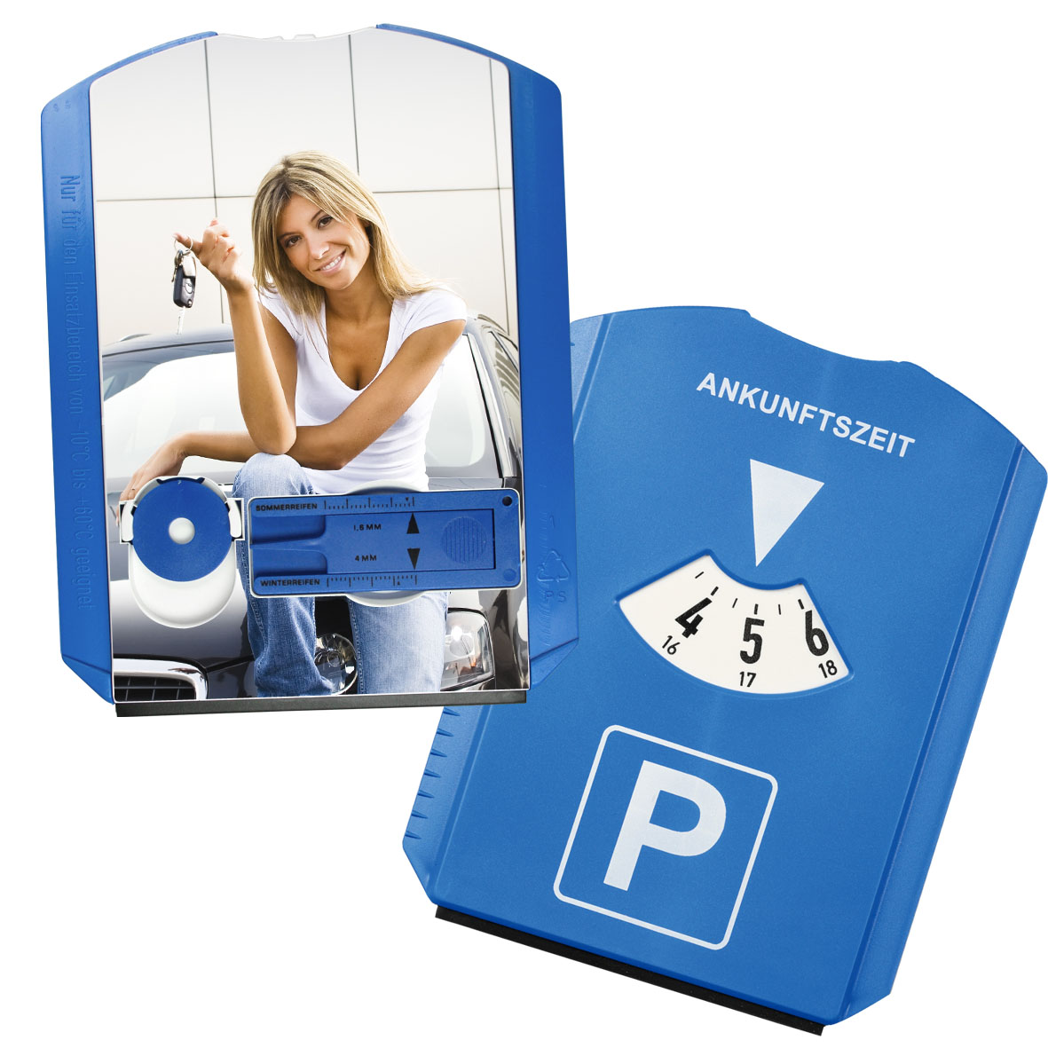 Kunststoff-Parkscheibe mit glatter Kratzkante, Kratzzacken und Wasserabstreifer. Auf der Rückseite befinden sich 2 standardmäßig befüllte Halterungen für einen Einkaufswagenchip und einen Reifenprofilmesser. Entspricht Paragraph 42 StVO. Einsetzbar von -10°C bis +60°C. Auf Anfrage auch in verschiedenen Sprachvarianten erhältlich.