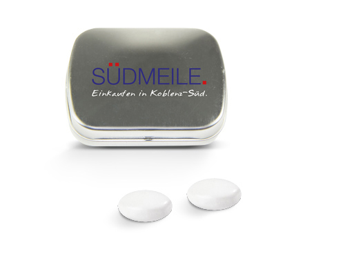 Produkt: Scharnierdeckel-Dose mit gewölbtem Deckel, matt-silber aus Metall, individuell bedruckt, mit Originalitätsverschluss und Aufreißperforation br>Inhalt: Mentos Kaugummi (Pfefferminz) zuckerfrei, ca. 22 g br>Haltbarkeit: 24 Monate br>Preise: € / Stück inkl. 4-c Tampondruck zzgl. Drucknebenkosten.