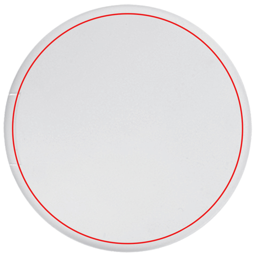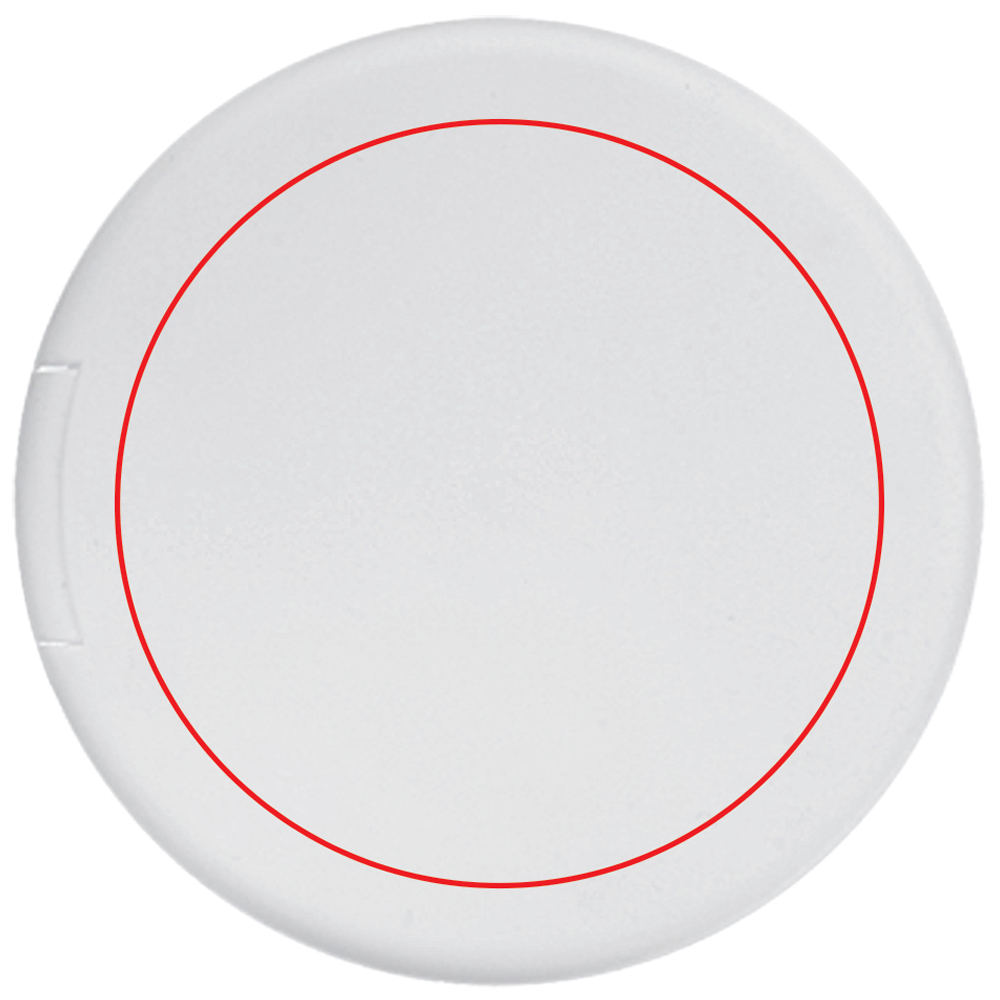 Flache und runde Pfefferminzdose, erhältlich in transparenten Farben oder in weiß. Ca. 6,5g zuckerfreies Pfefferminz. Die Druckfläche ist für einen vollfarbigen Digitaldruck geeignet. Die Produktspezifikationen befinden sich auf der Rückseite der Dose.