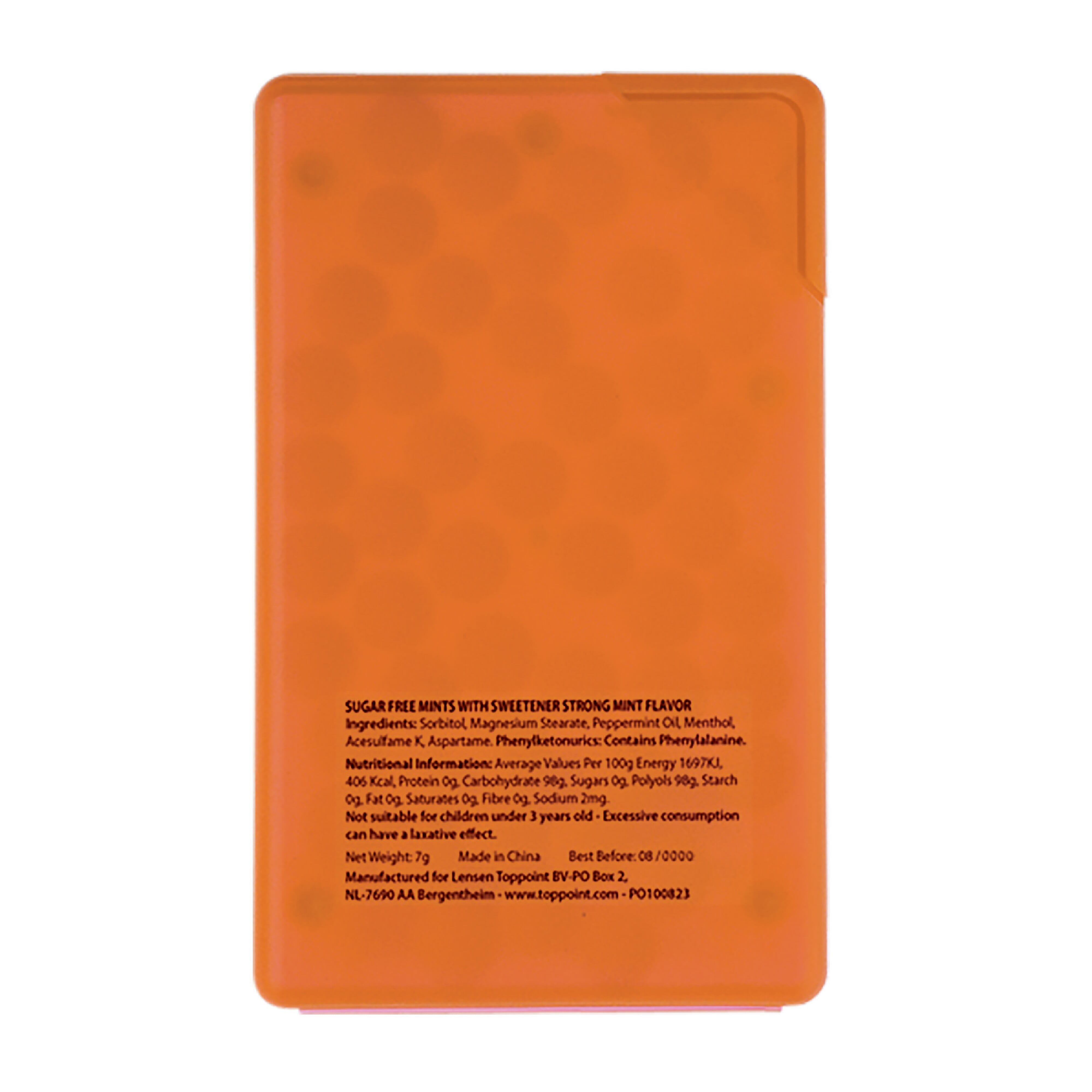 Rechteckiger Pfefferminzspender mit ca. 7g zuckerfreien Pfefferminz.