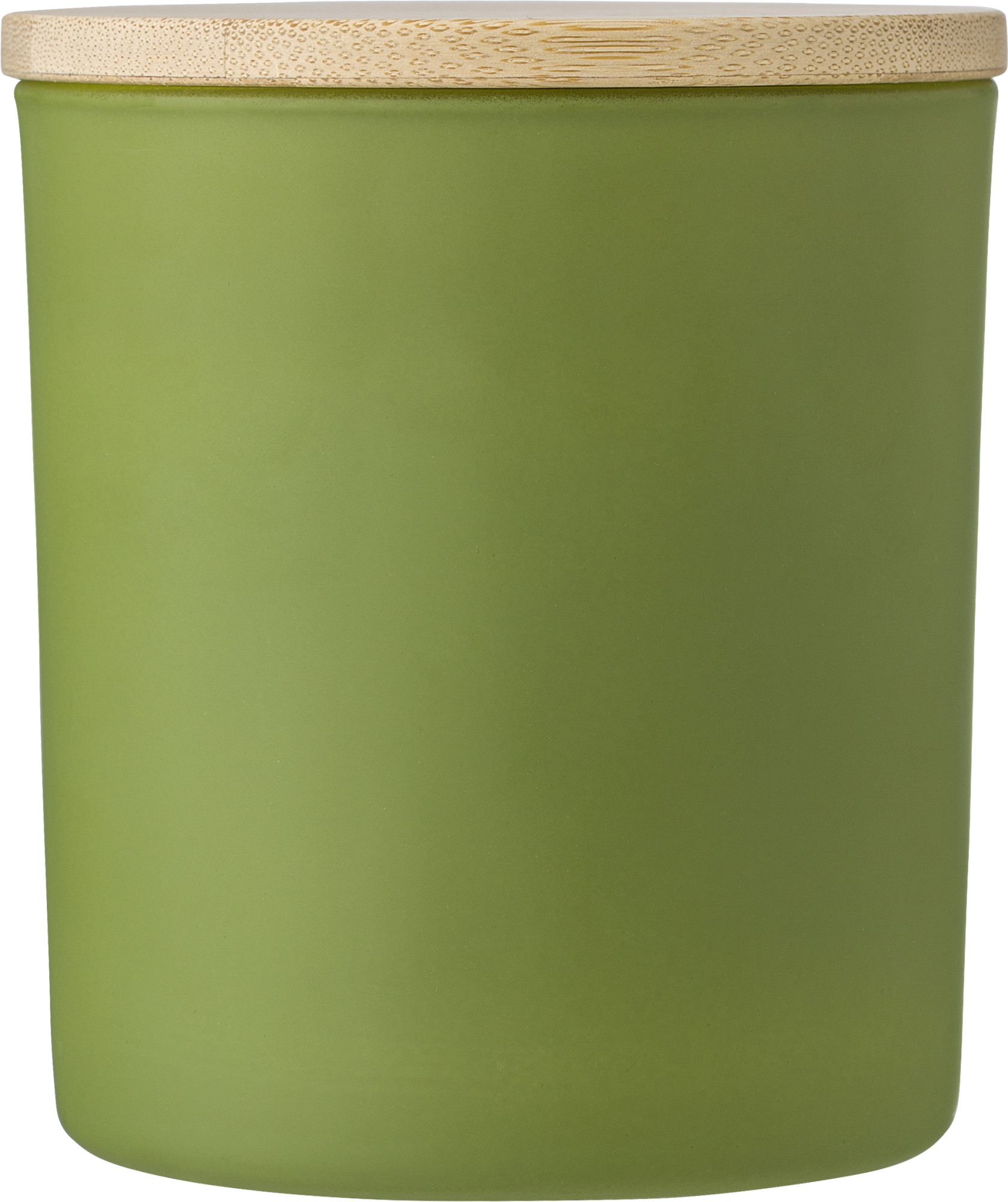 Glaskerze mit pflanzlichem Wachs und einem Deckel aus Bambus. Die Kerze enthält hauptsächlich Wachs auf pflanzlicher Basis (Carnaubawachs) und hat eine Brenndauer von etwa 20 Stunden. Vier Düfte je nach Glasfarbe: Zimt (rot), Vanille (weiß), Sandelholz (schwarz) und Jasmin (grün). Einzeln verpackt in einer weißen Verpackung. Größe Kerze: Durchmesser 7cm / Höhe 8,5cm