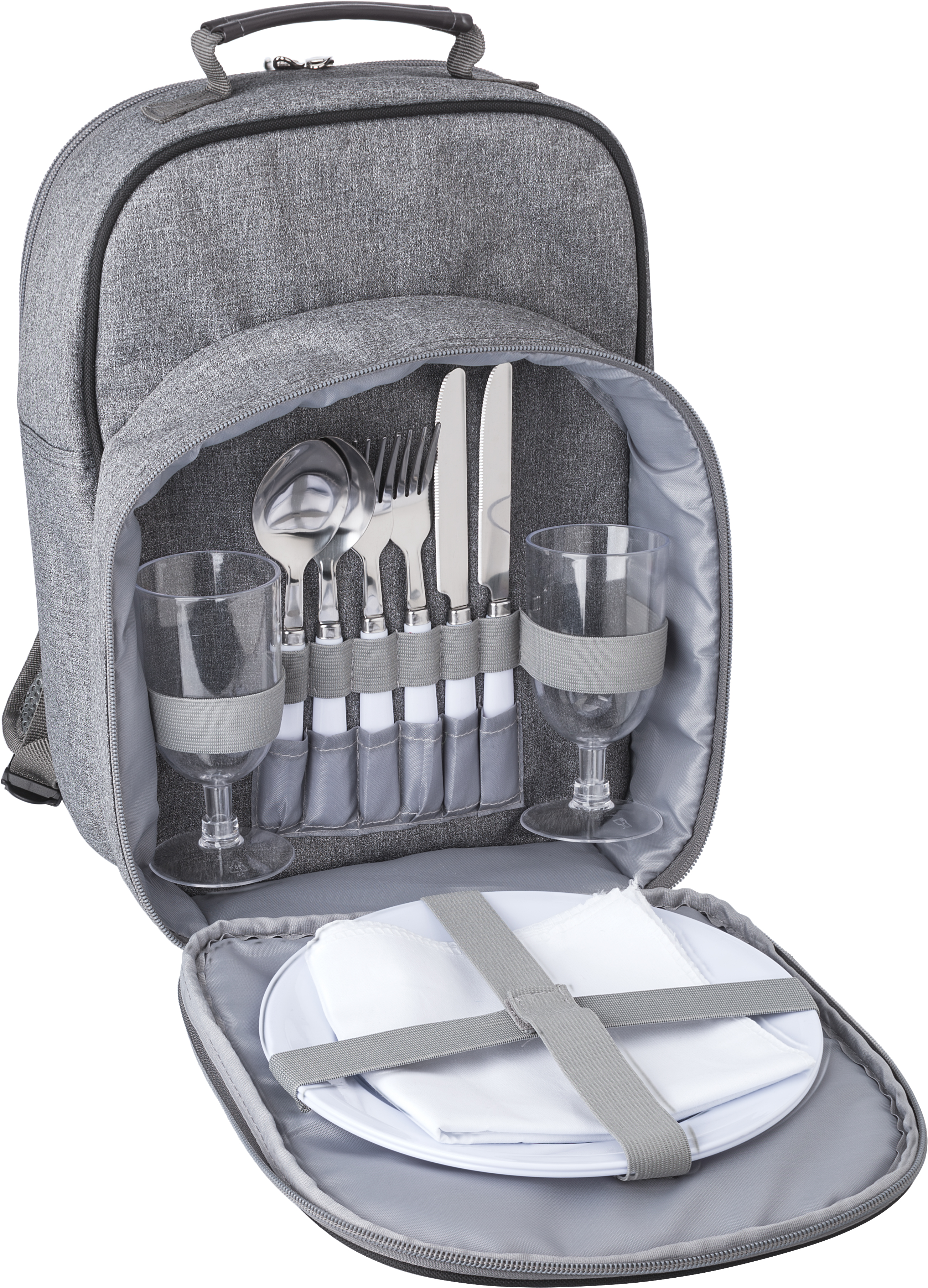Picknick-Kühlrucksack aus Polycanvas (600D) mit Beschichtung aus Aluminium. Ein Hauptfach und eine Vodertasche mit Besteck, Bechern und Tellern für zwei Personen. Verstellbare Schulterriemen.