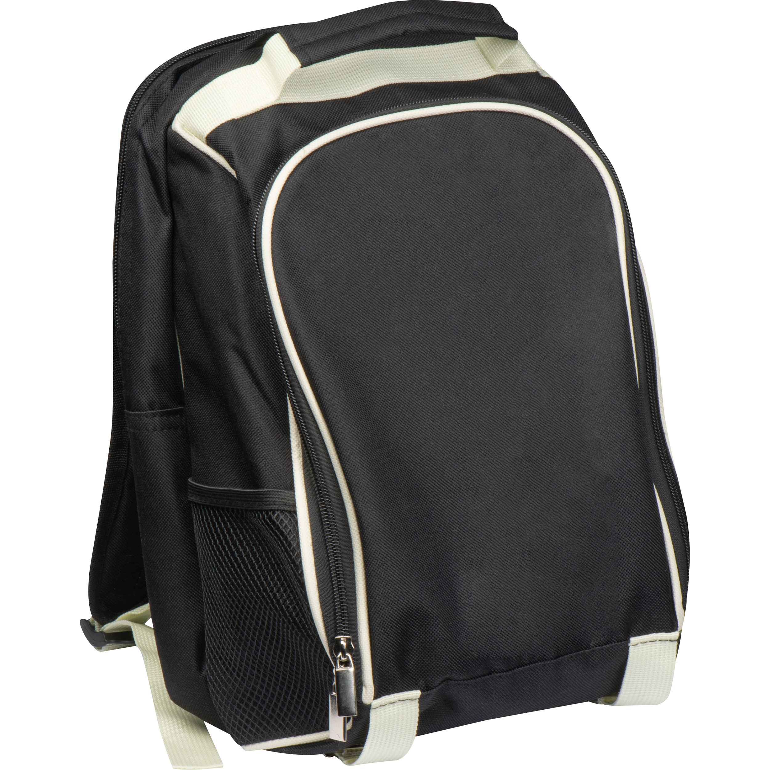 Praktischer Picknickrucksack aus robustem Polyester mit integrierter Kühltasche, Edelstahl-Isolierkanne, Schneidebrett, 2 Tassen, 2 Löffeln, 1 Messer, Salz- u. Pfefferstreuer und Servietten. Ihre Werbung drucken wir auf die Vortasche.