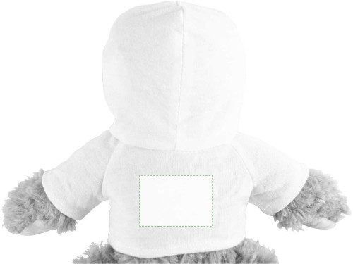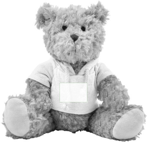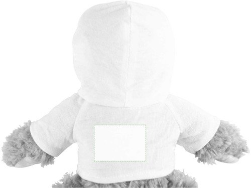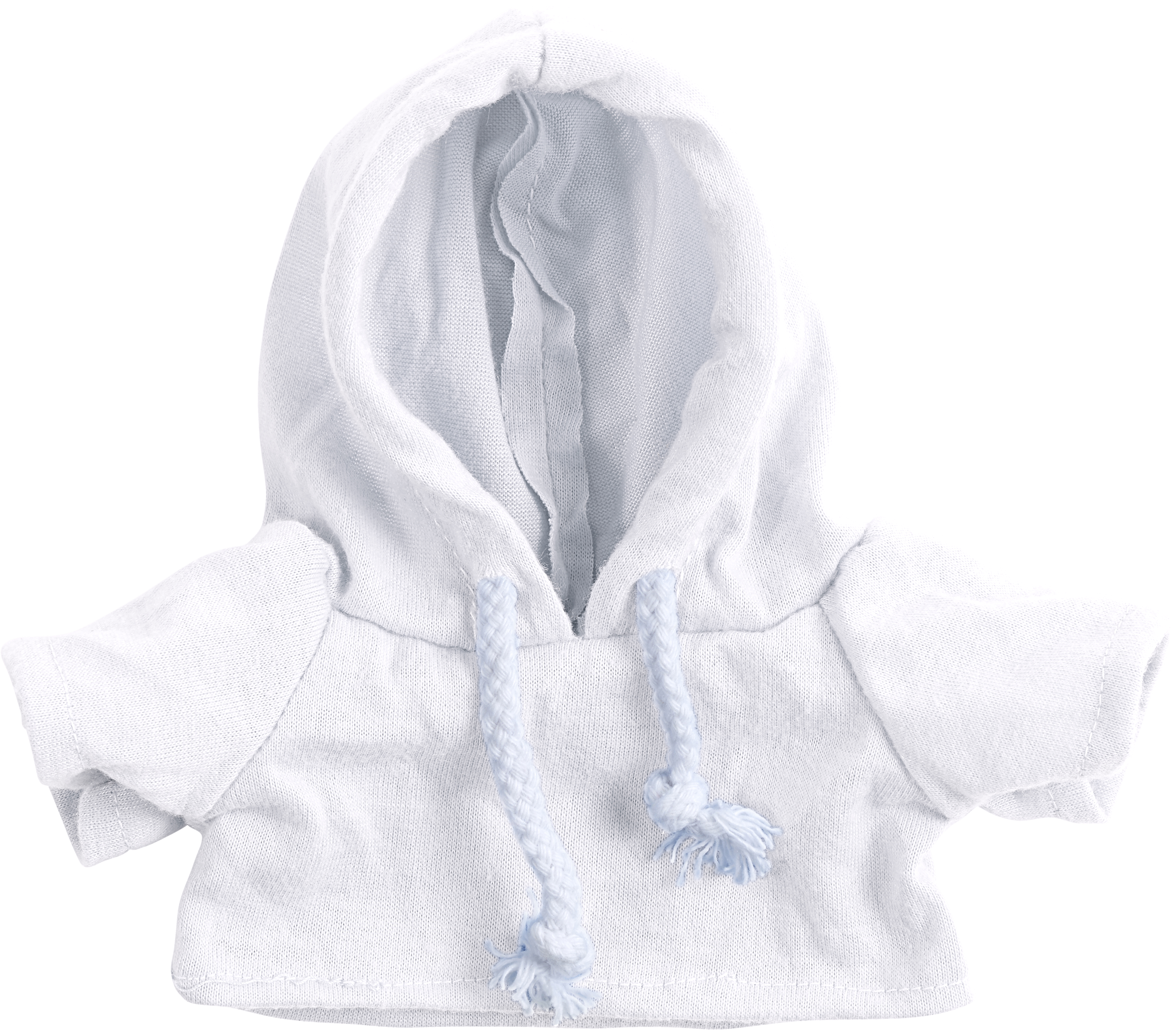 Plüsch-Teddybär mit aufgenähten Augen und Kapuzenpullover mit weißen Kordeln.