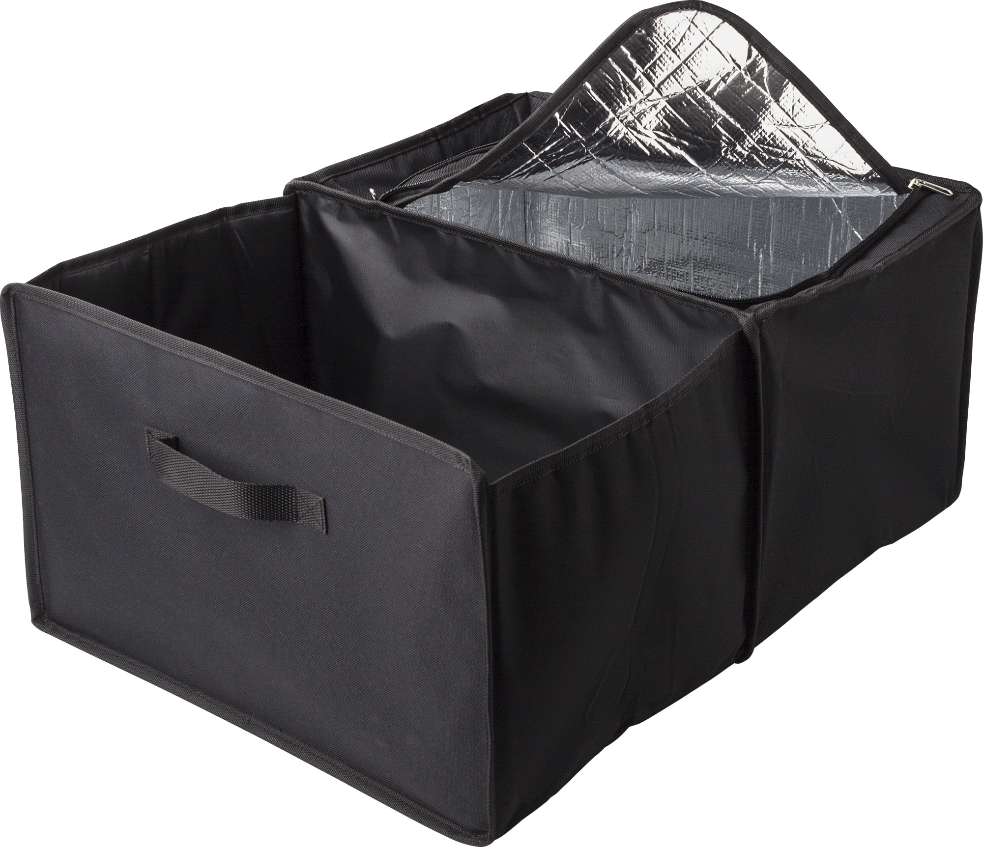 Autotasche aus Polyester (600D). Zwei Fächer, eine Kühltasche mit Reißverschluss geschlossen. Aluminium innen auf der Seite der Kühltasche. Zusammenklappbar.