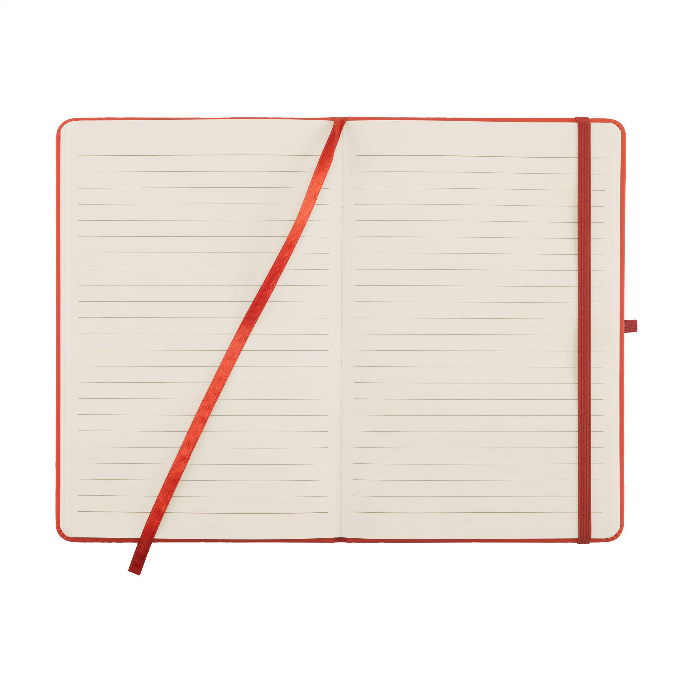 Praktisches Notizbuch im A5-Format. Mit hartem RPET-Cover und ca. 80 Blatt/160 Seiten cremefarbenem, liniertem Papier (70 g/m²). Mit praktischem Verschlussgummiband, Lesezeichen und Stiftschlaufe.