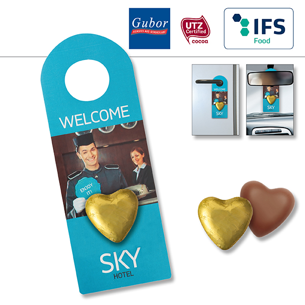 Promo Türanhänger mit Schokoladenherz / Preise pro Stück inkl. Werbeaufdruck 4-farbig zzgl. Nebenkosten. Allgemeine Süßigkeiten-Beschreibung: Füllung: 1 personalisierbares (1-4 farbig) Schokoladenherz, Haltbarkeit ca. 6 Monate bei sachgerechter Lagerung- Promo Türanhänger mit Schokoladenherz für Ihre Süße Werbung mit Geschmack.