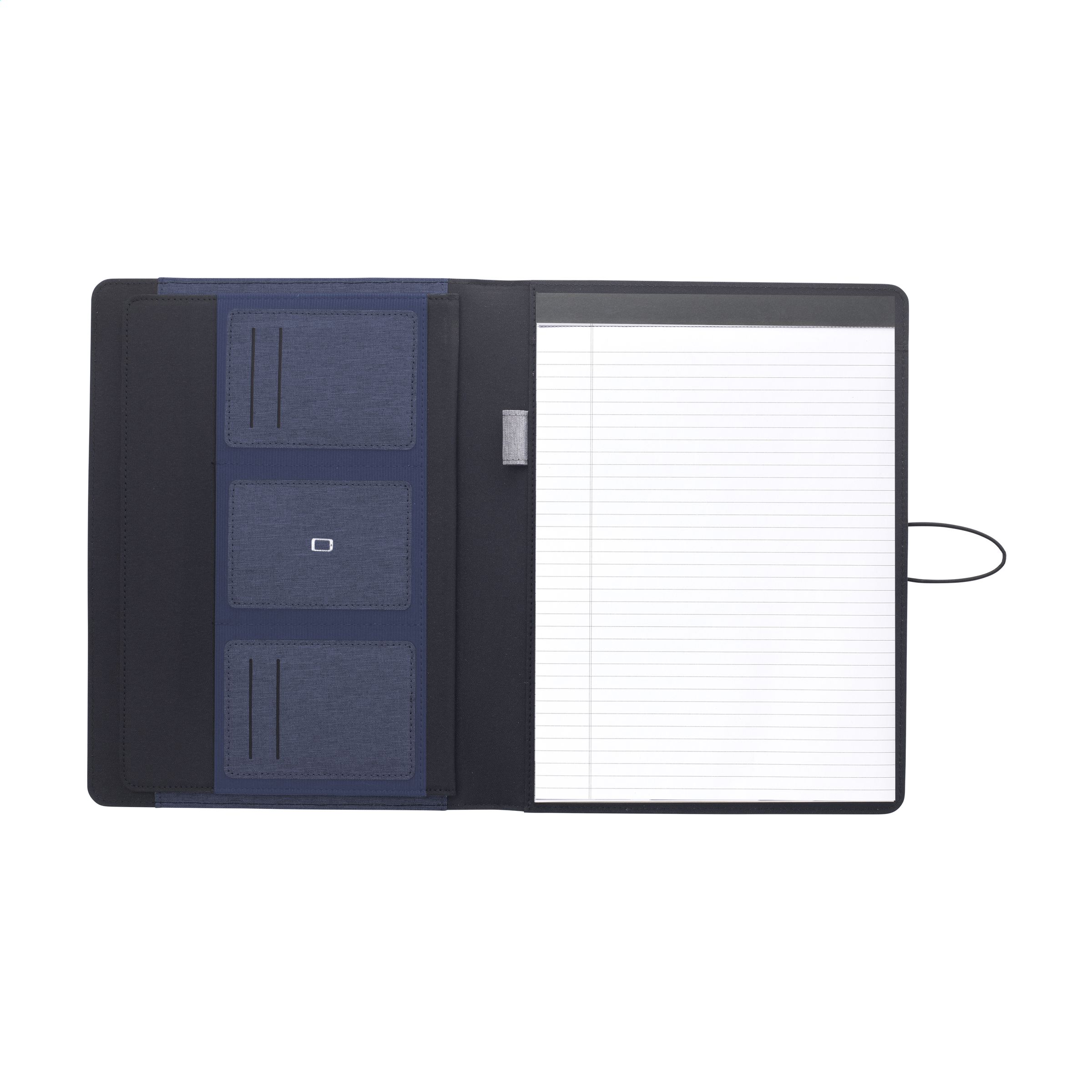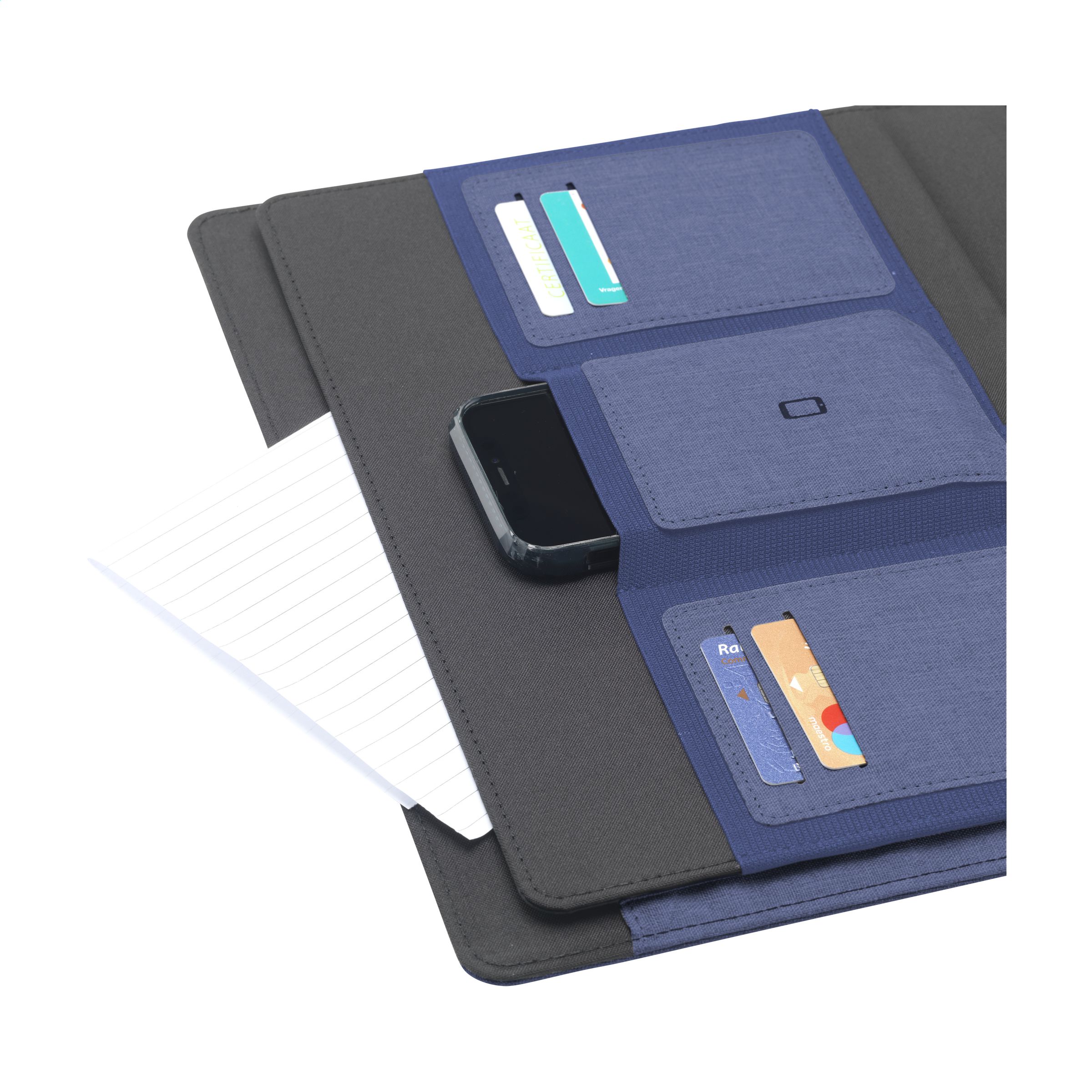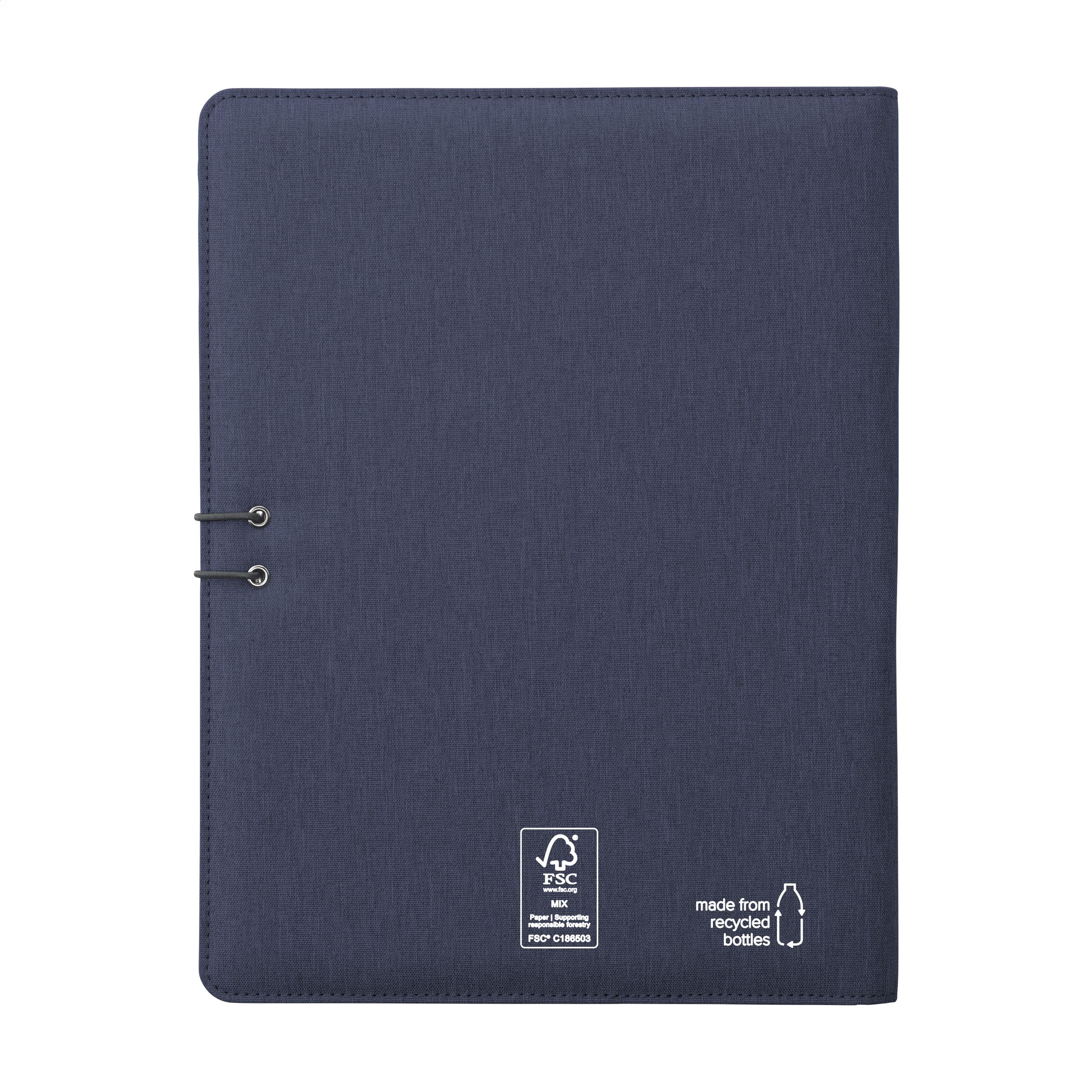 WoW! Moderne Schreibmappe/Dokumentenmappe aus RPET-Material im A4-Format. Ausgestattet mit mehreren Einsteckfächern, darunter ein separates Fach zur Aufbewahrung eines Mobiltelefons, sowie einer Stiftschlaufe. Inkl. Schreibblock mit 20 Blatt FSC® zertifiziertem, weißem, liniertem Papier (70 g/m²). RCS-certified. Total recycled material: 6%.