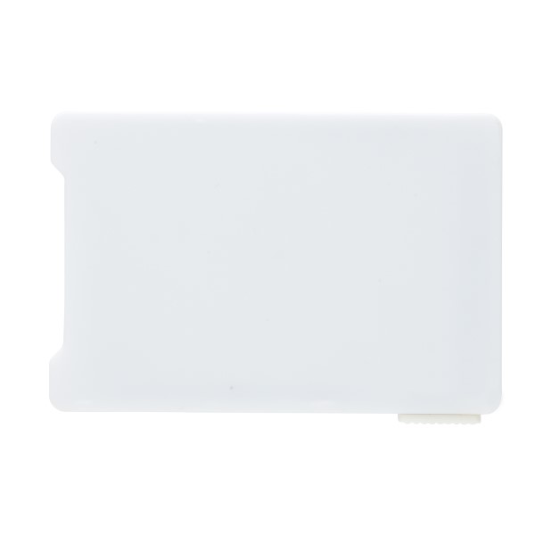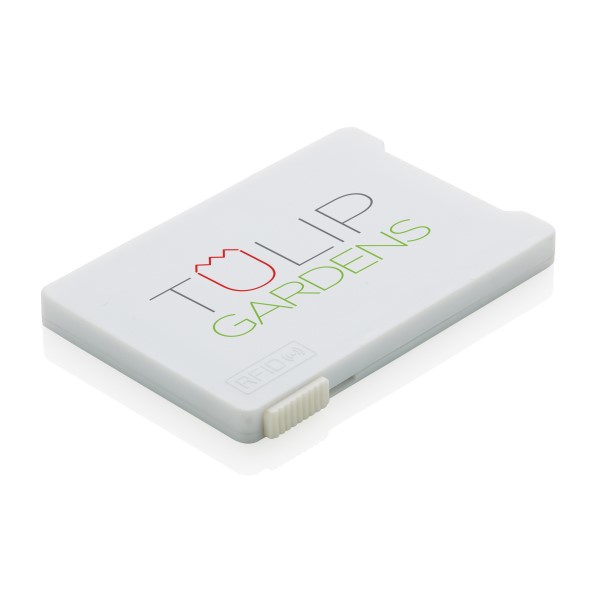 Dieser RFID-Karthalter schützt bis zu 4 Karten oder bis zu 3 mit Prägung vor unerwünschtem Datendiebstahl. Der Schieber auf der Seite bringt die Karten zum Vorschein. Registered design®