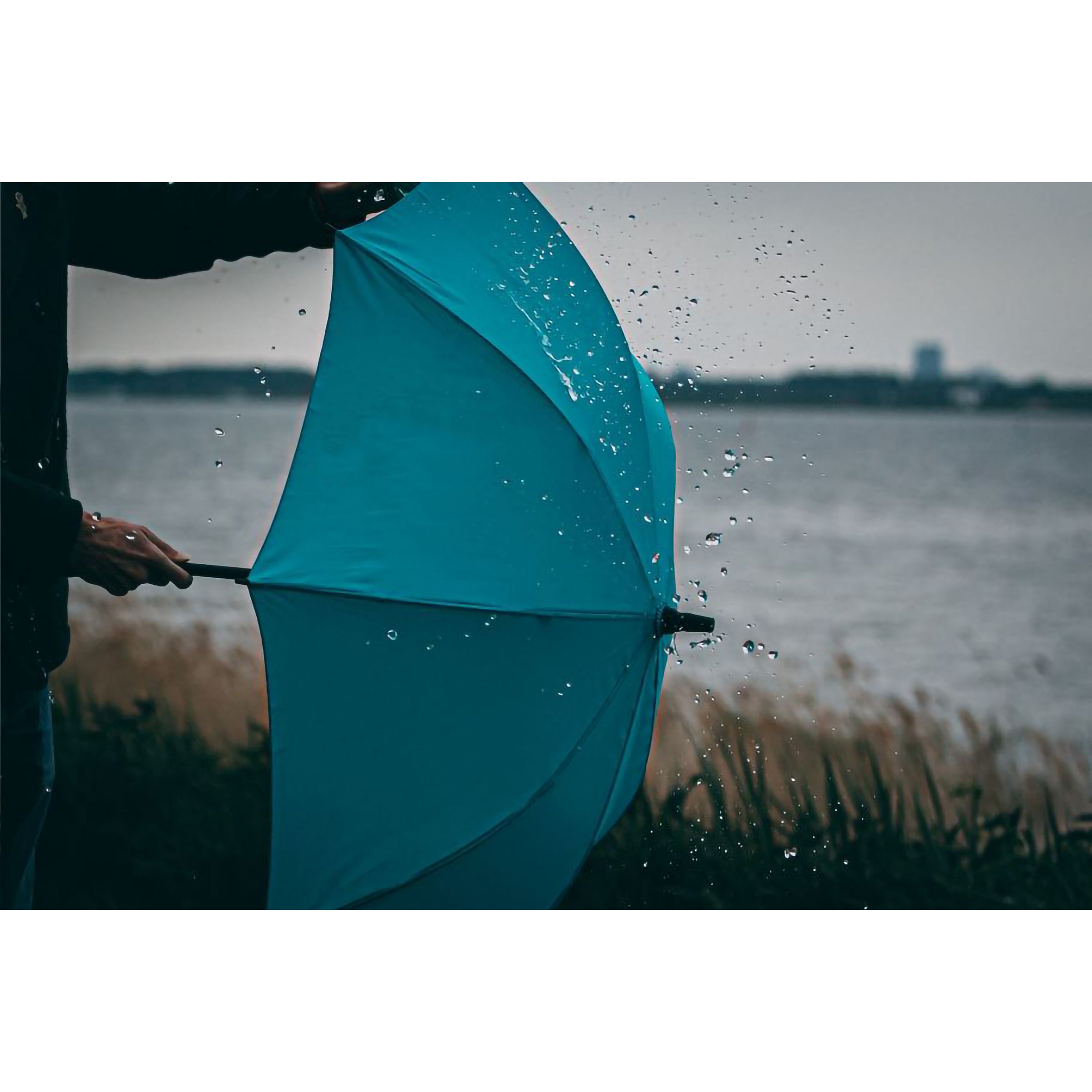 Automatik-Regenschirm mit einer Bespannung aus rPET-Pongee (190T), einem Handgriff aus Bambus und ein Gestell aus Metall.