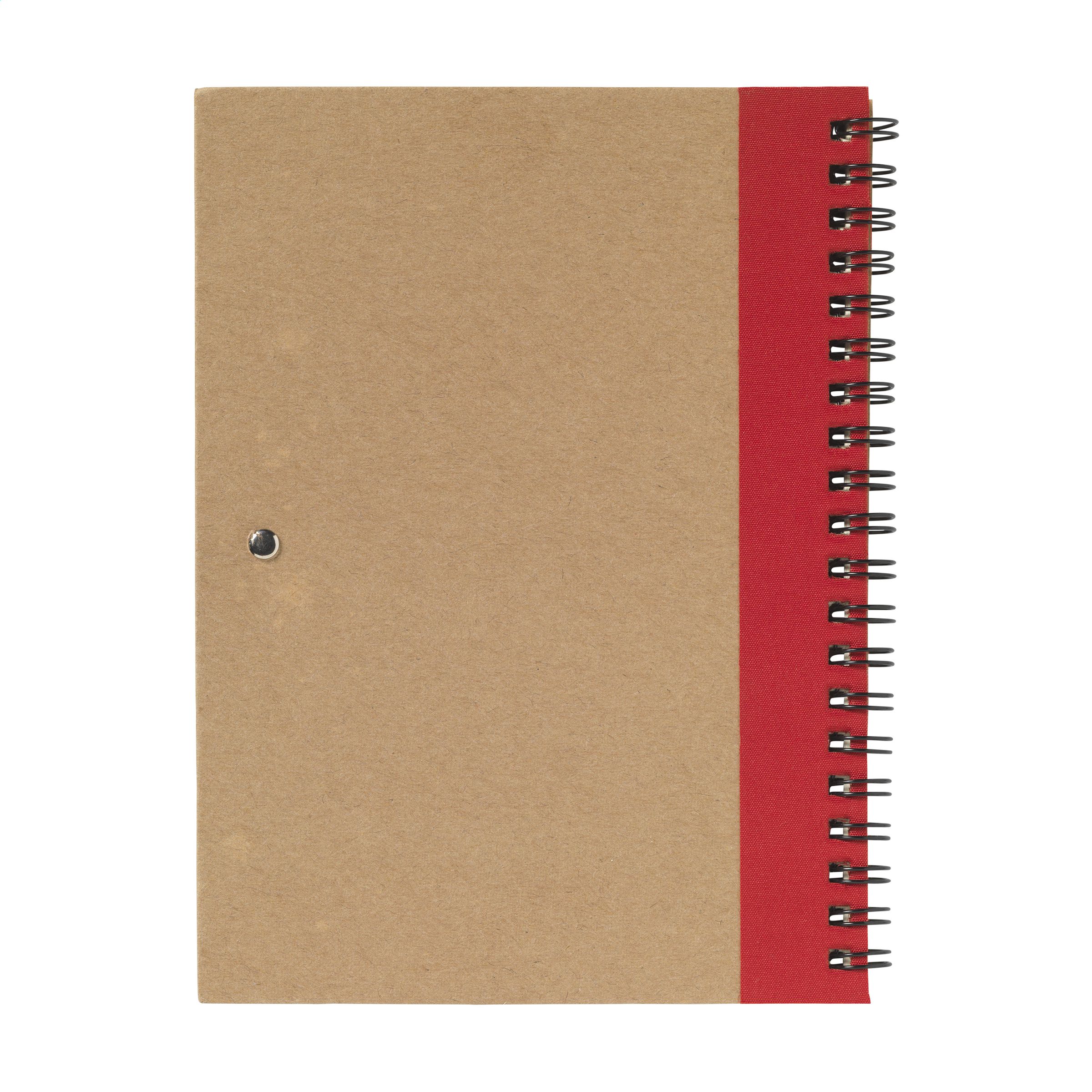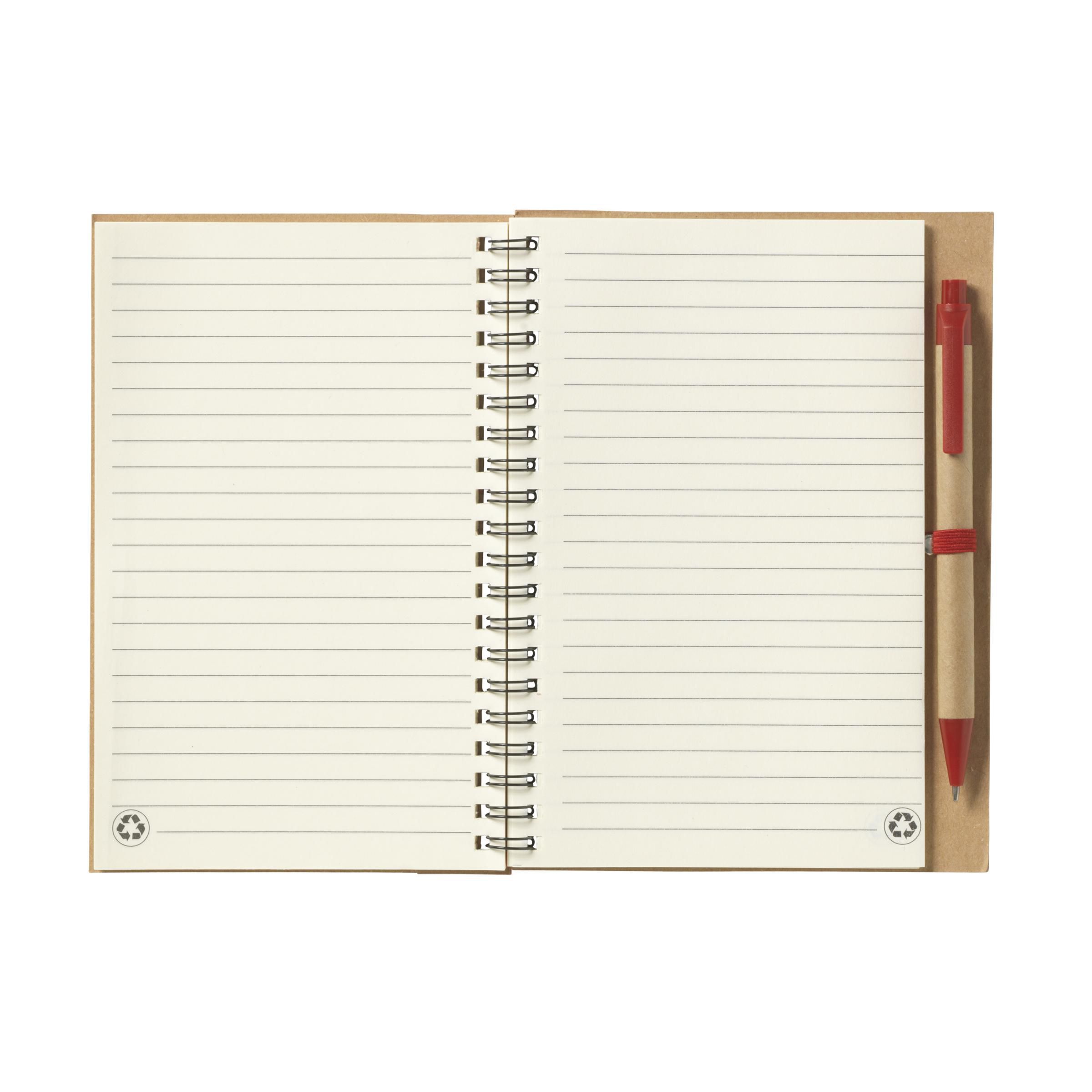 Notizbuch aus recyceltem Material mit ca. 70 Blatt/140 Seiten cremefarbenem, liniertem Papier (70 g/m²), kartoniertem Umschlag. Gebunden in einer starken, metallenen Spiralbindung. Inkl. blauschreibendem Kugelschreiber.