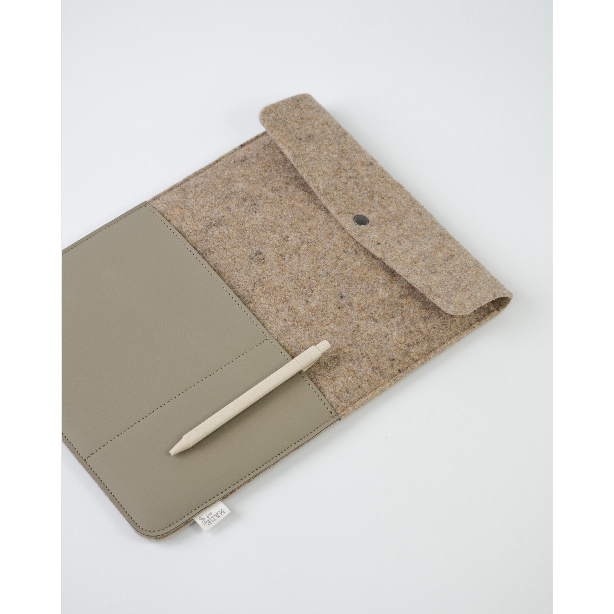 Eine minimalistische, aber stilvolle 16-Zoll-Laptoptasche aus recyceltem Wollfilz und veganem Leder. Mit Überschlag und Druckknopfverschluss. Ein Produkt der Marke MADE out of. Der Wollfilz besteht zu 50% aus recyceltem Material, zu 30% aus Wolle und zu 20% aus PE. Die Tasche hat einen Druckknopfverschluss und ist auf der Vorderseite mit 2 Einsteckfächern versehen. Diese sind aus wunderschönem veganen Leder aus dem recycelten Fruchtfleisch von Äpfeln gefertigt. Es sieht aus wie echtes Leder und fühlt sich auch so an – und die Fächer verleihen der Tasche eine luxuriöse Ausstrahlung. Geeignet für die Aufbewahrung und den sicheren Transport eines Laptops bis zu 16 Zoll. Dieses Spitzenprodukt ist handgefertigt. Niederländisches Design. Made in Holland.