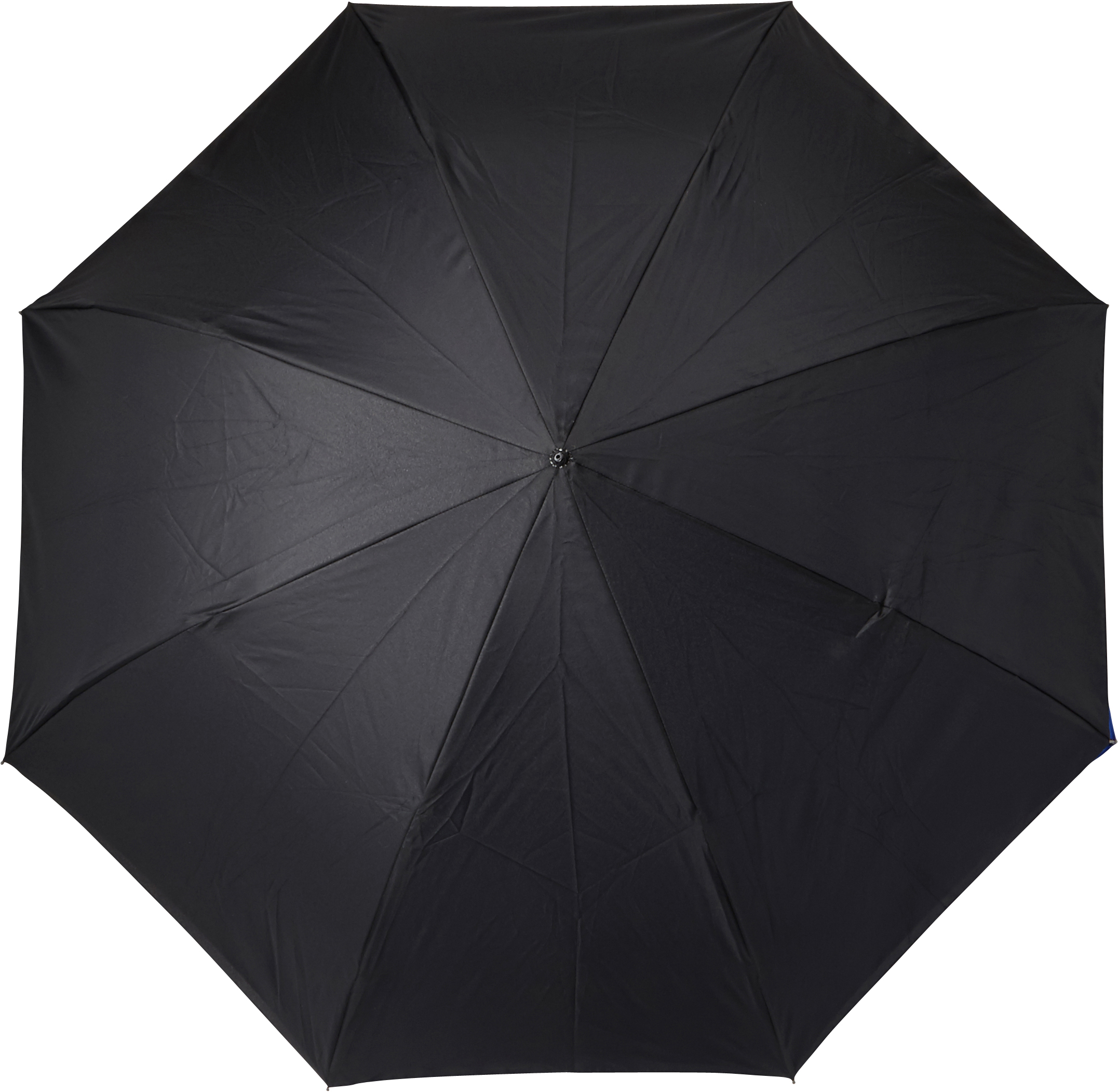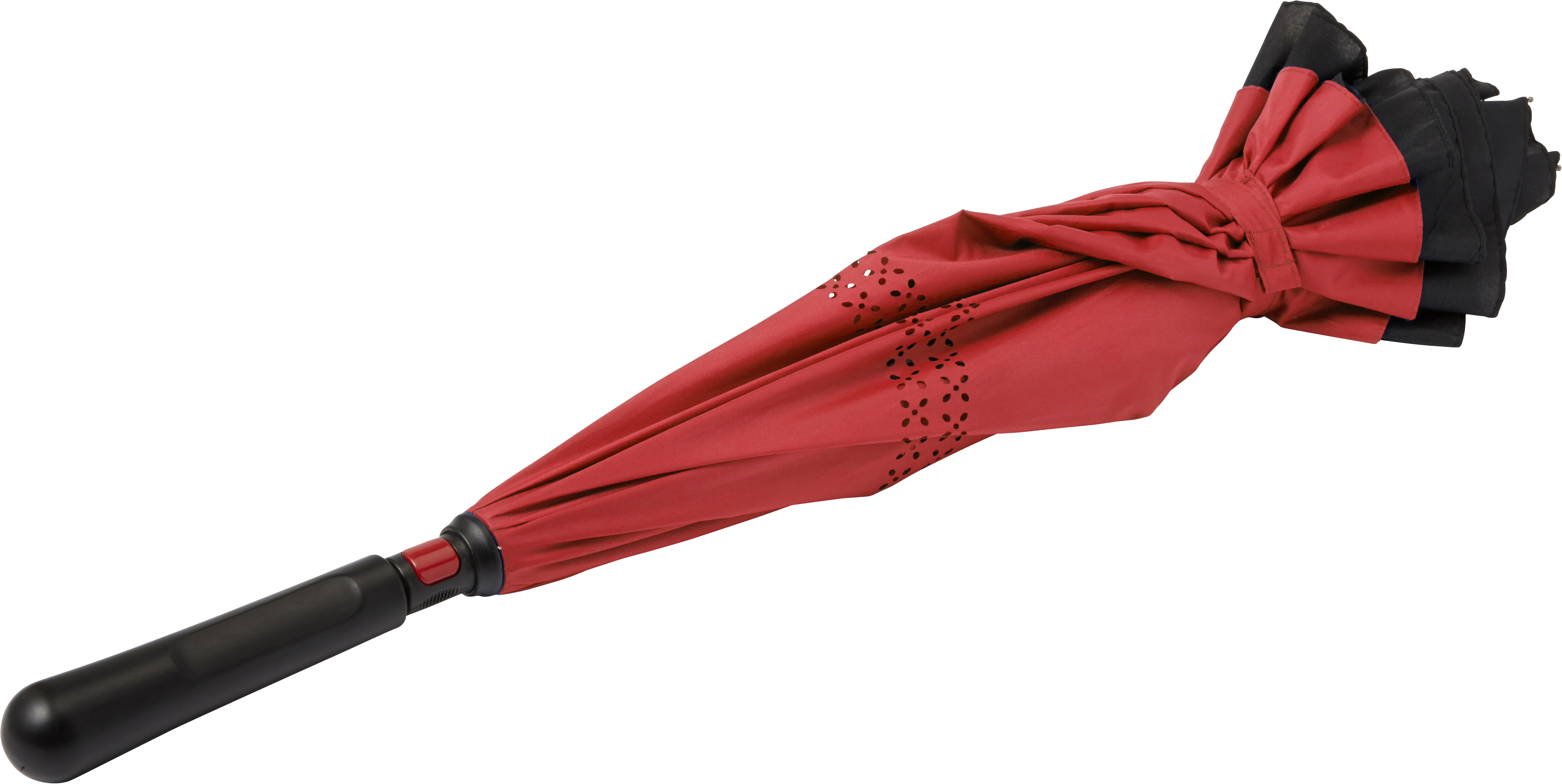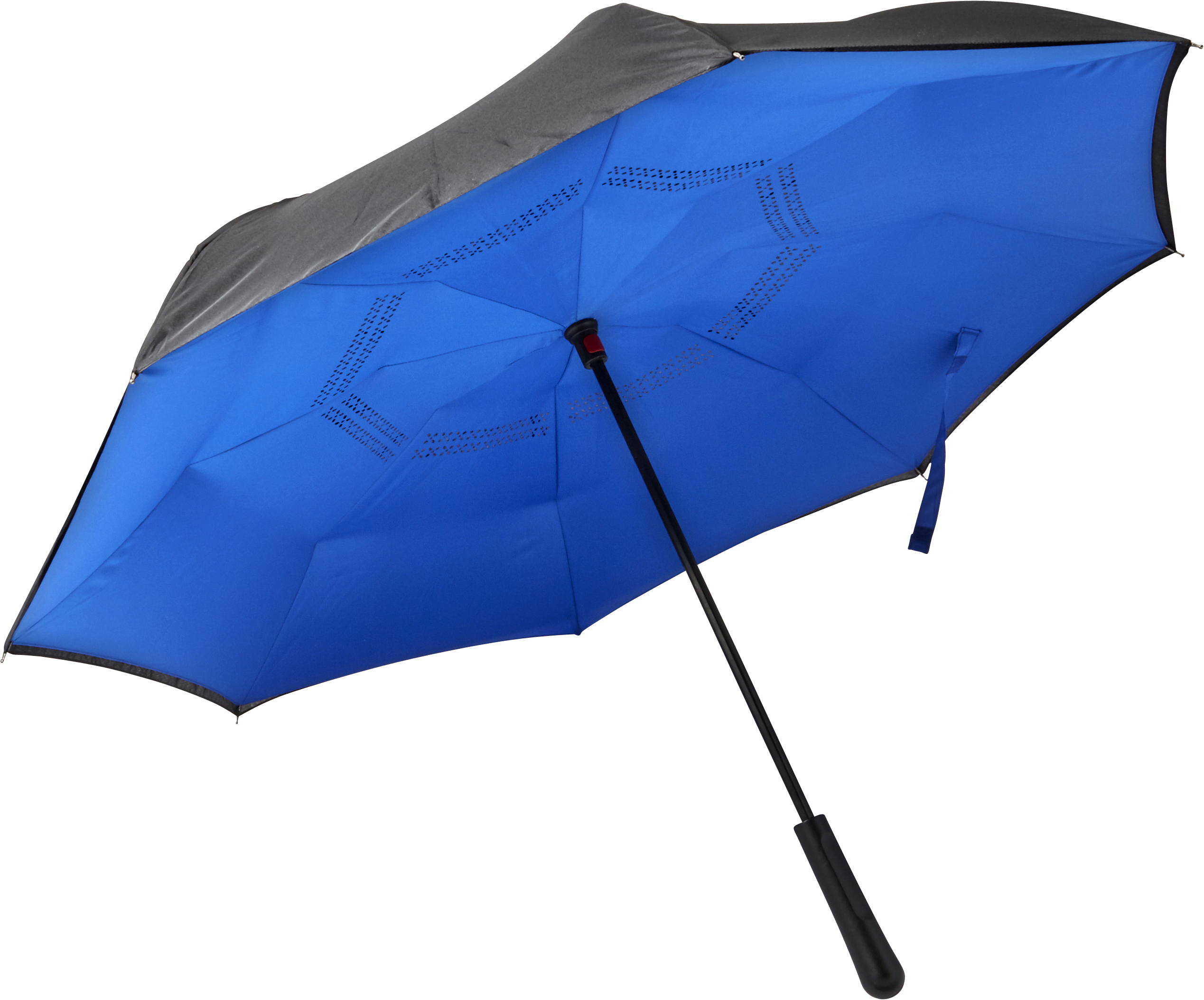 Regenschirm, reversibel, doppelt beschichtet aus Pongee-Seide, mit schwarzem Fiberglasgestell und -stangen, Aluminiumschaft, Kunststoffgriff und Klettverschluss.