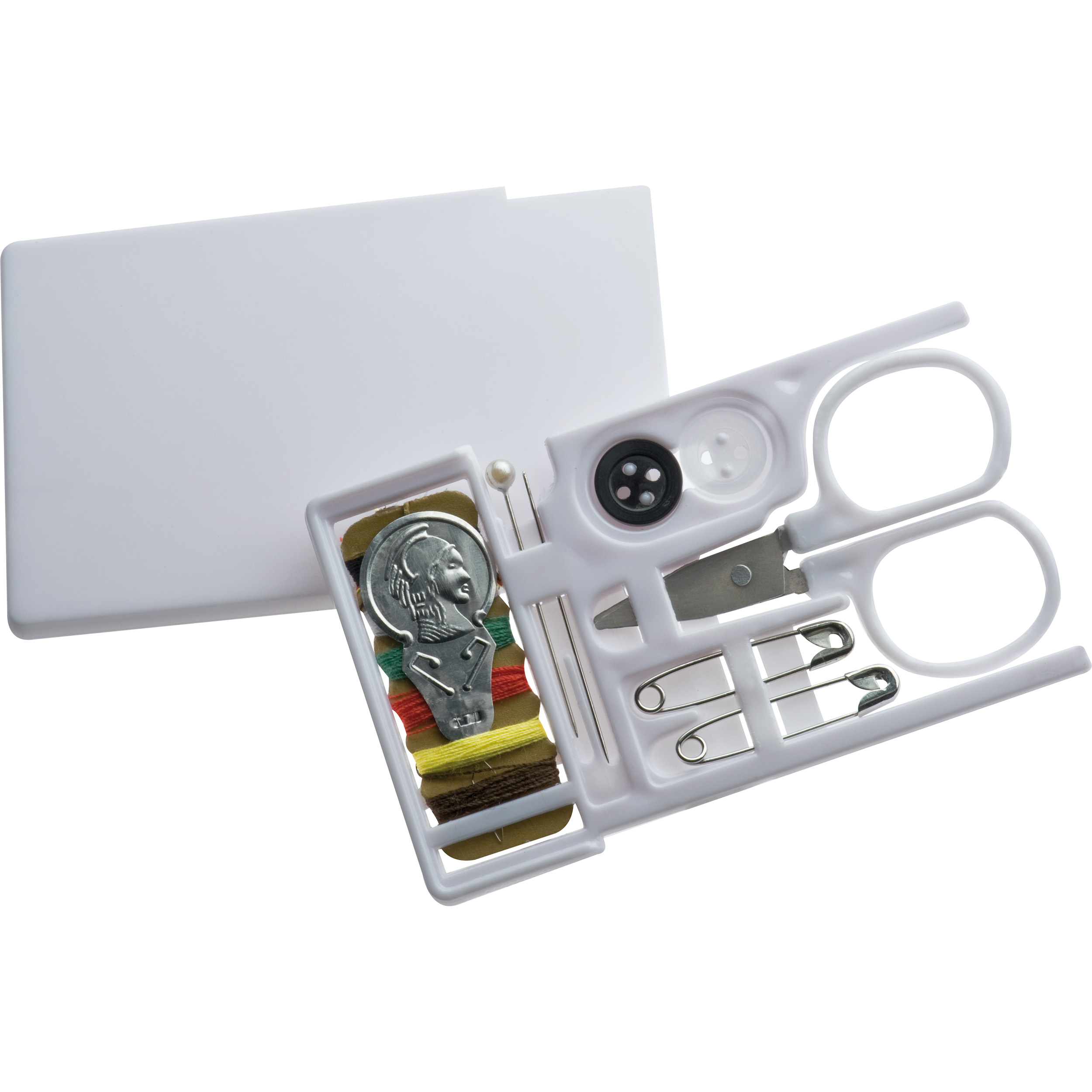 Handliches Reise-Nähset im praktischen Scheckkartenformat mit vielseitigem Inhalt zum Herausschieben. Ihre Werbung drucken wir auf die Oberfläche.