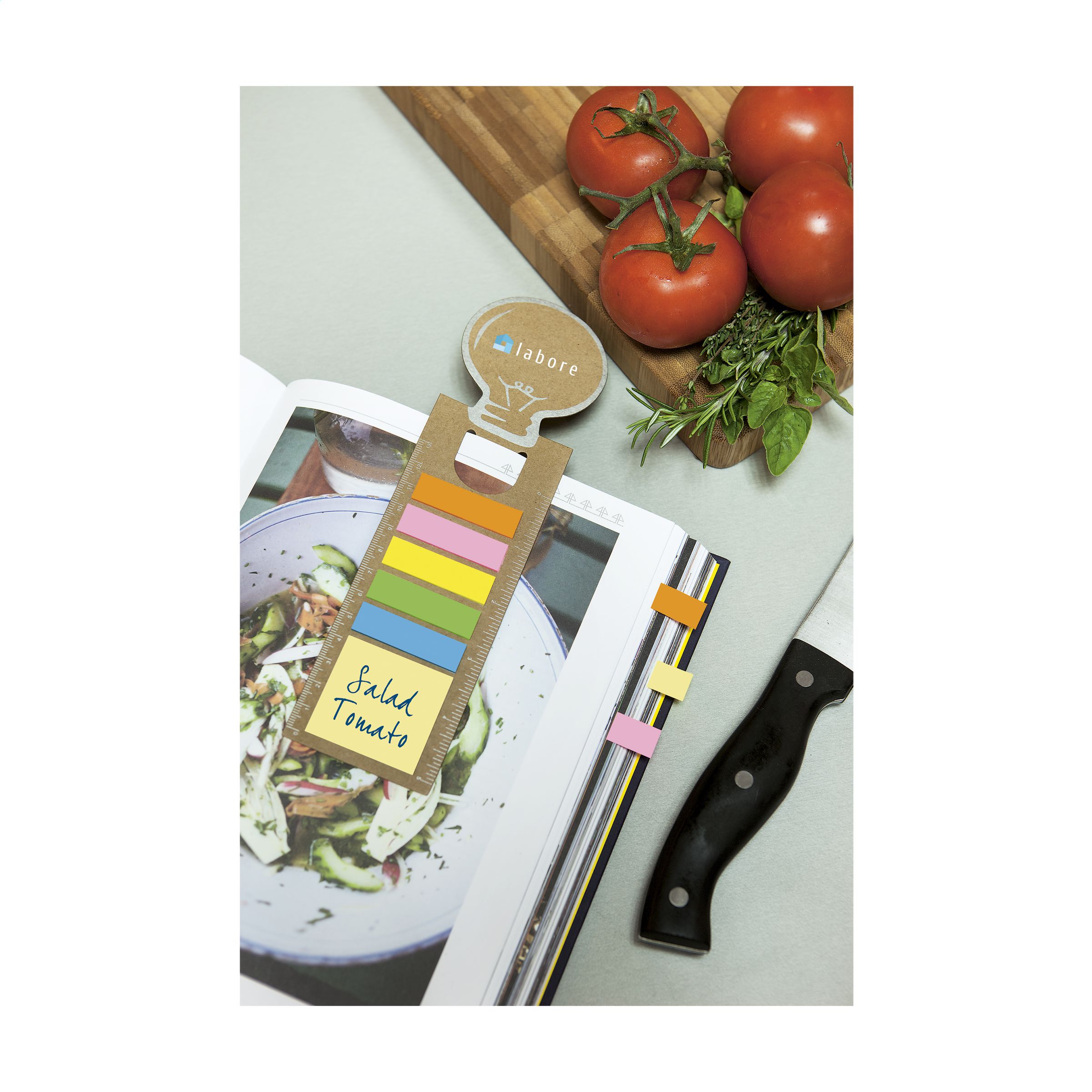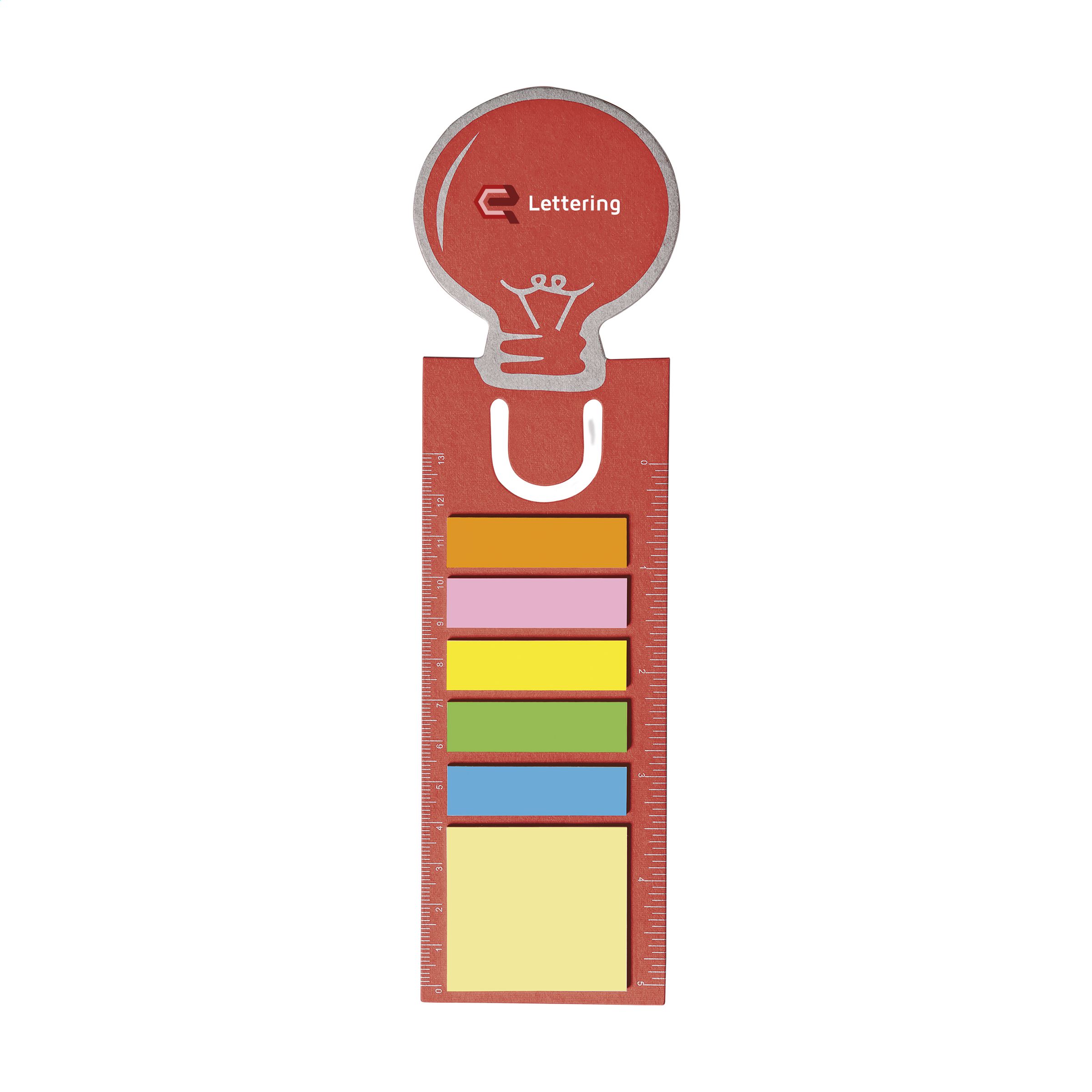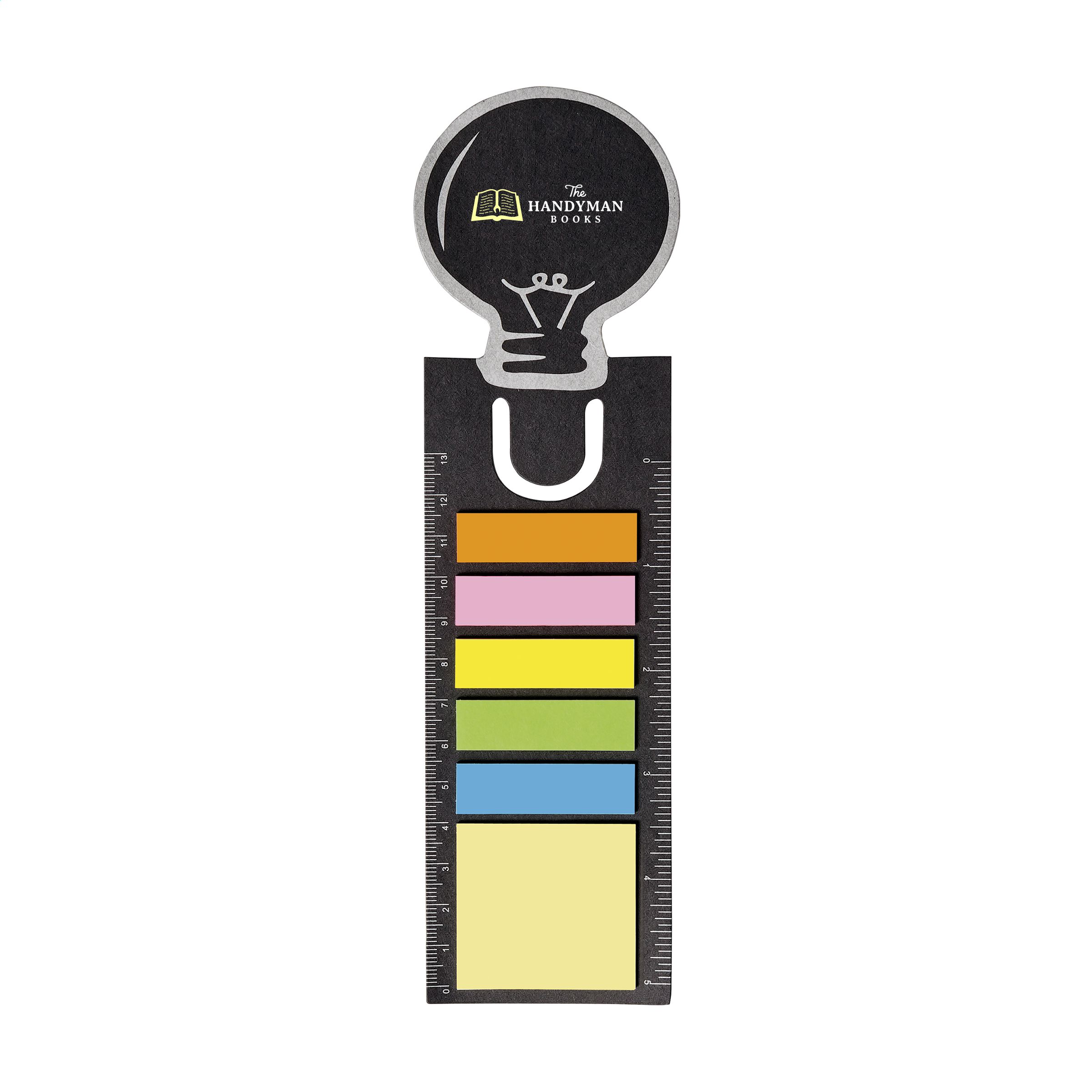 Lesezeichen aus stabilem Karton mit 15 selbstklebenden Memoblättchen, 75 beschreibbaren Markierstickern und Lineal (Länge 13 cm/5 inches).