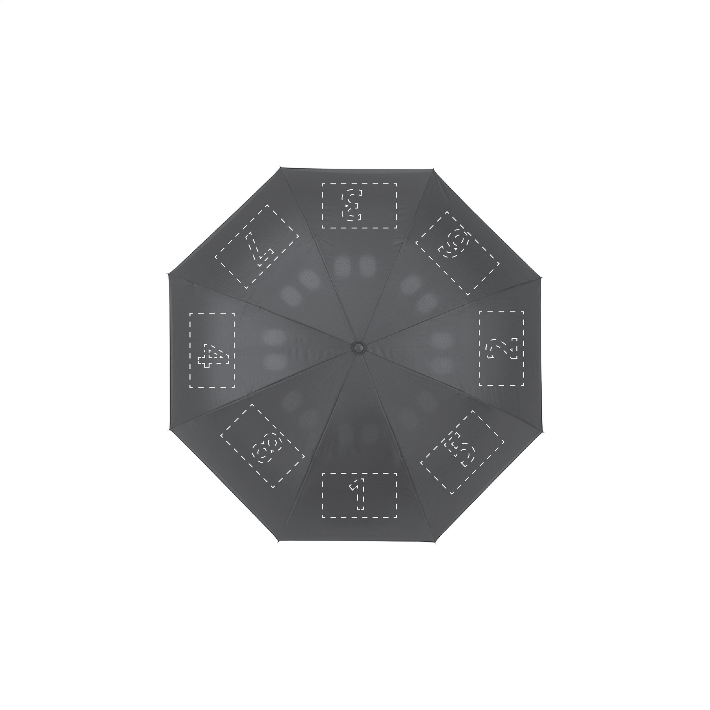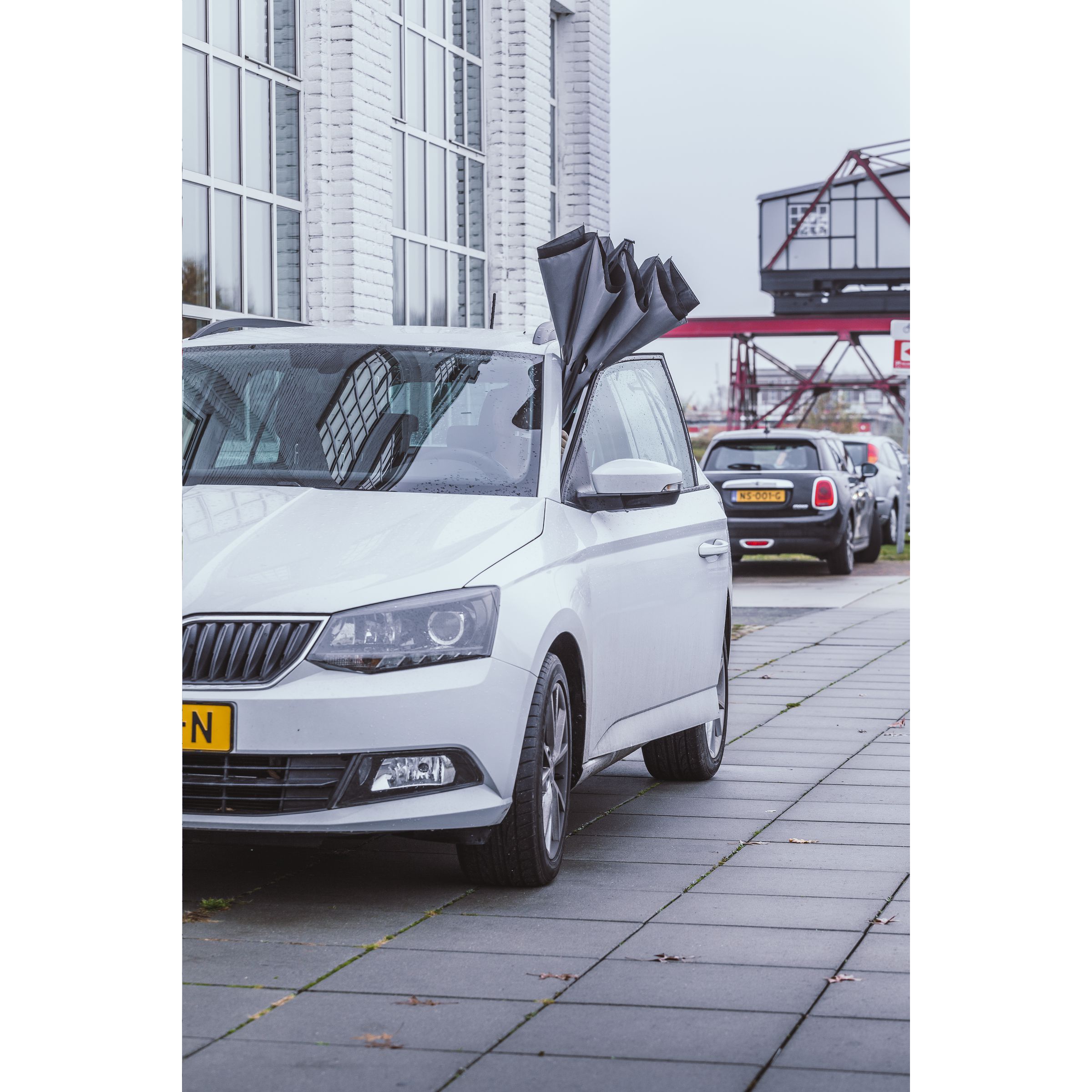 Großer, innovativer Umkehrregenschirm mit doppelter 190T-Pongeeabdeckung. Spezielles Material, das die Trocknung beschleunigt. Kann im Stehen trocknen. Schließt automatisch, öffnet manuell. Ideal für das Ein- und Aussteigen beim Auto. Metallrahmen mit winddichtem System und ergonomisch geformtem Griff mit Trageschlaufe.