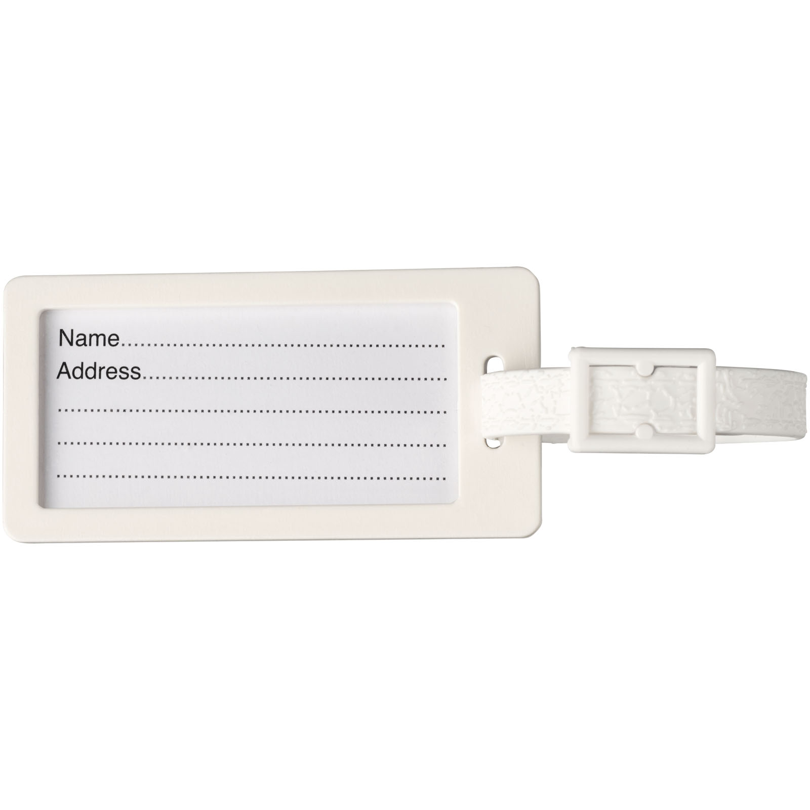 Ein strapazierfähiger Gepäckanhänger samt Papiereinsatz, klarer Schutzhülle und passendem Kunststoffgurt. .
