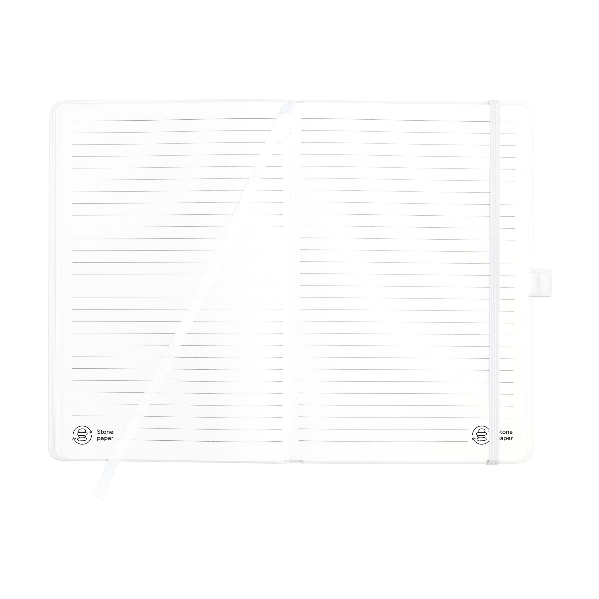 WoW! Dieses Notizbuch im Format DIN A5 ist aus baumfreiem Papier hergestellt. Es umfasst ca. 64 Blatt/128 Seiten (170 g/m²) cremefarbenes, liniertes Papier aus Naturstein: 80% Kalziumkarbonat und 20% Harz (HDPE), um den Stein zu binden. Der Einband ist ebenfalls aus 950-Gramm-Steinpapier mit einer Thermo-PU-Beschichtung gefertigt. Das Notizbuch ist mit einer praktischen Stiftschlaufe, einem Gummiband zum Verschließen und einem Lesebändchen ausgestattet. Steinpapier ist eine Alternative zu herkömmlichem Papier, da für seine Herstellung weit weniger Rohstoffe verwendet werden: keine Bäume, kein Wasser, keine Bleichmittel und keine Chemikalien. Das Besondere an diesem Produkt: Neben dem schönen, glatten Papier ist es auch unendlich recycelbar. Darüber hinaus ist das Papier antibakteriell, wasserfest, reißfest und schmutzabweisend.
