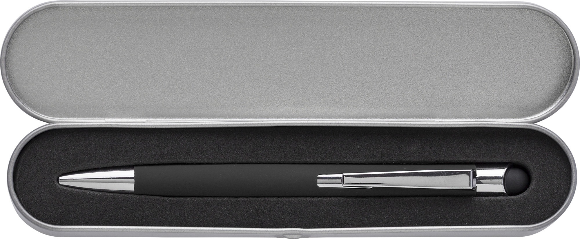 Rollerball aus Aluminium mit gummierter Griffzone, geeignet für Touchscreens. Wird in einem Stifte-Etui geliefert. Mit schwarzer Mine. Ausgestattet mit deutscher Dokumententinte.