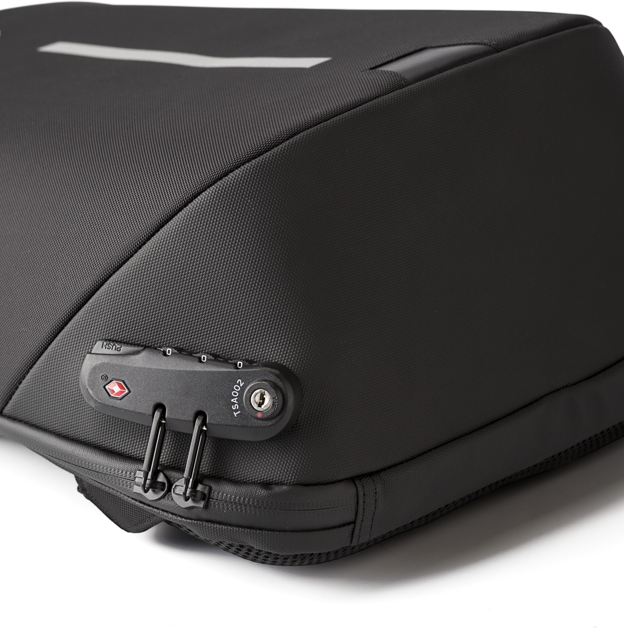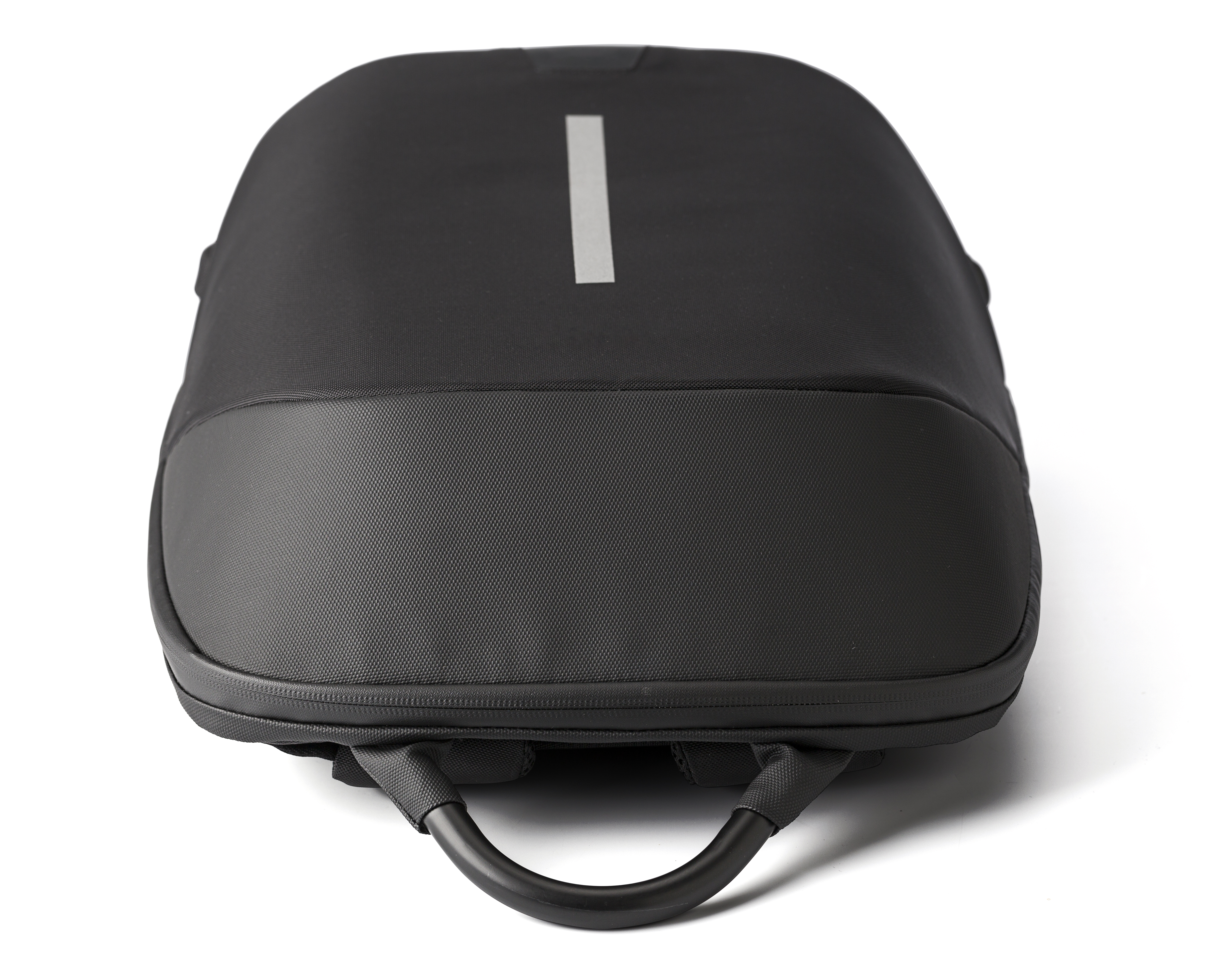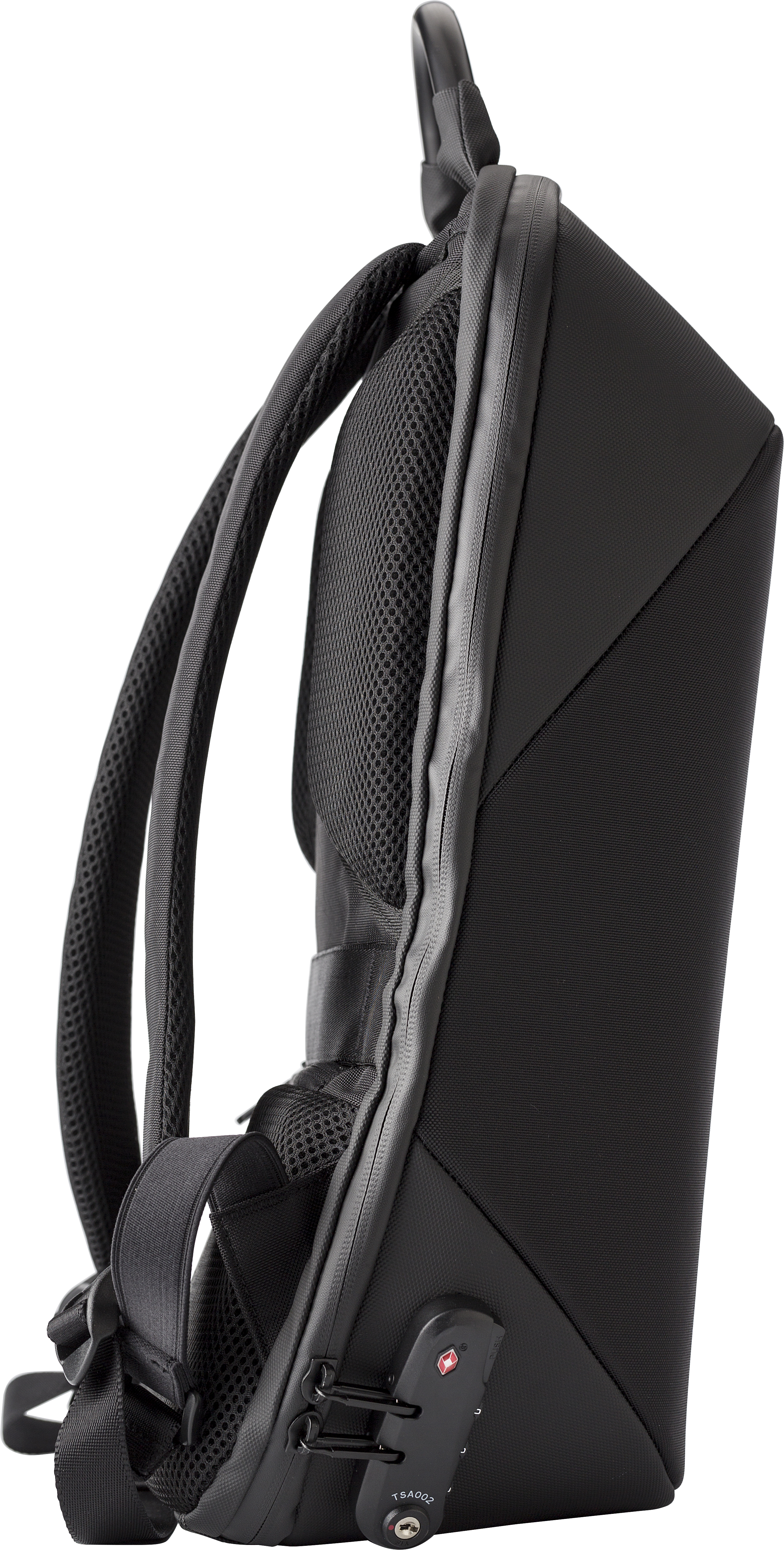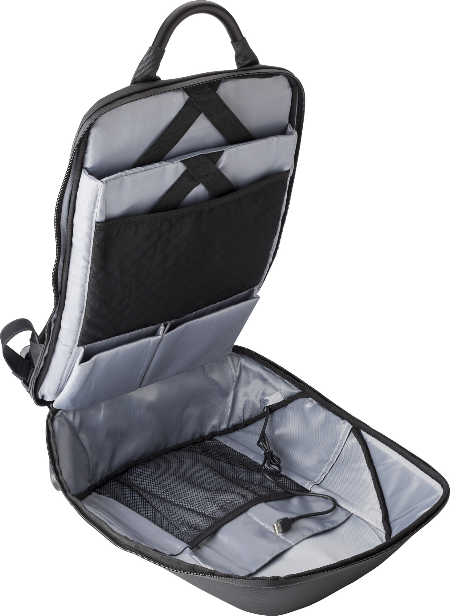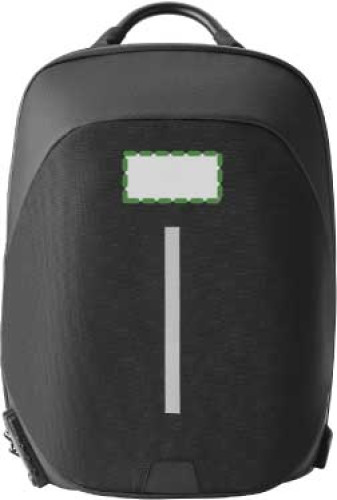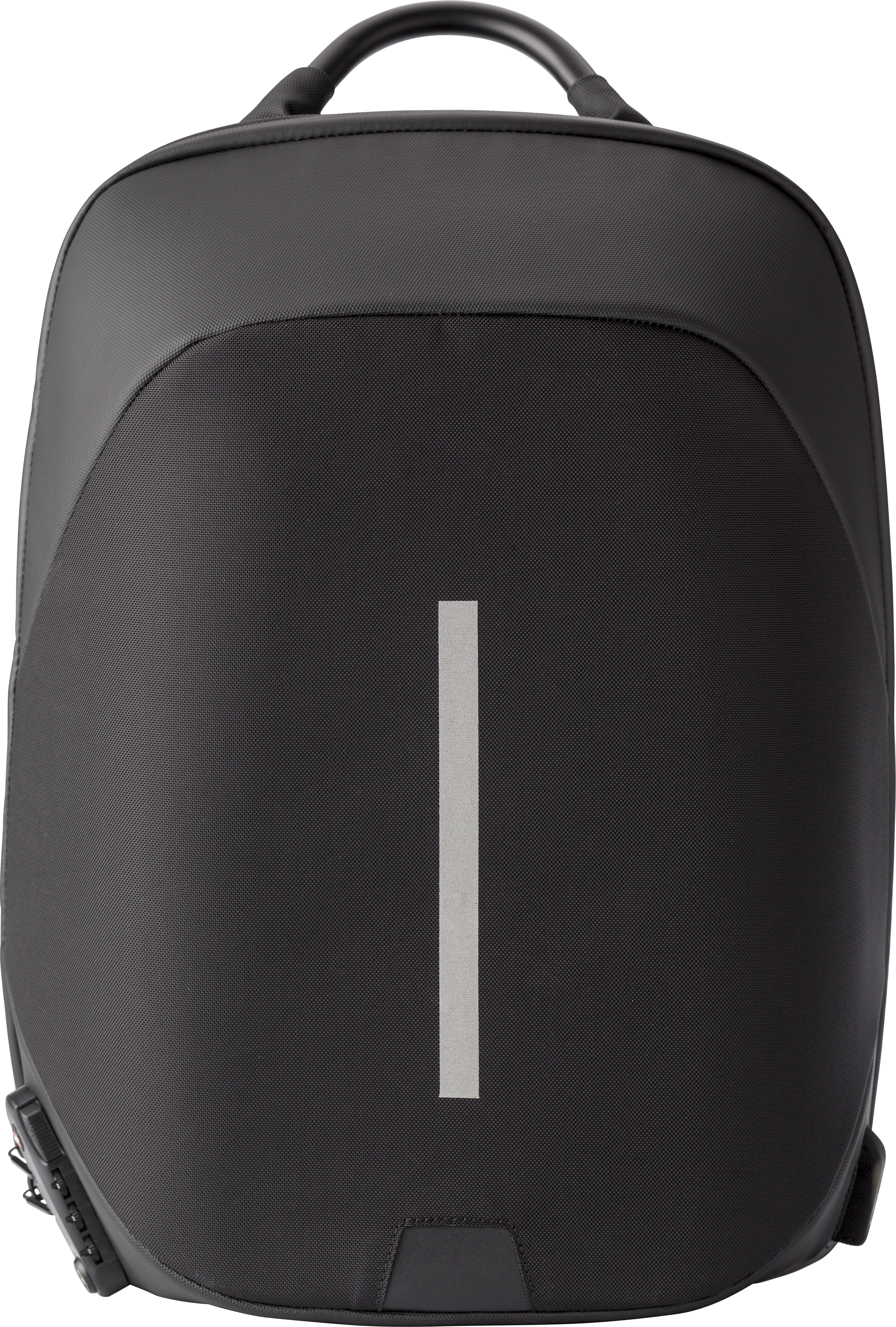 Laptoprucksack aus Nylon (1200D) mit Innenfächern und einem gepolsterten Laptopfach (passend bis 15““). Gepolsterter Rücken und verstellbare Schultergurte. Digitales Zahlenschloss, USB-Anschluss und Kabel, Taschengurt und Metallgriff.
