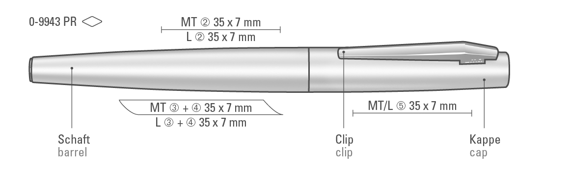 in Clipverlängerung 35mm x 7mm Lasergravur (L), in Clipverlängerung 35mm x 7mm Tampondruck (MT), gegenüber vom Clip 35mm x 7mm Lasergravur (L), gegenüber vom Clip 35mm x 7mm Tampondruck (MT), seitlich vom Clip 35mm x 7mm Lasergravur (L), seitlich vom Clip 35mm x 7mm Tampondruck (MT), auf der Kappe/auf dem Oberteil 35mm x 7mm Lasergravur (L), auf der Kappe/auf dem Oberteil 35mm x 7mm Tampondruck (MT), in Clipverlängerung 35mm x 7mm Einzelnamensgravur (EL), gegenüber vom Clip 35mm x 7mm Einzelnamensgravur (EL), seitlich vom Clip 35mm x 7mm Einzelnamensgravur (EL), auf der Kappe/auf dem Oberteil 35mm x 7mm Einzelnamensgravur (EL)