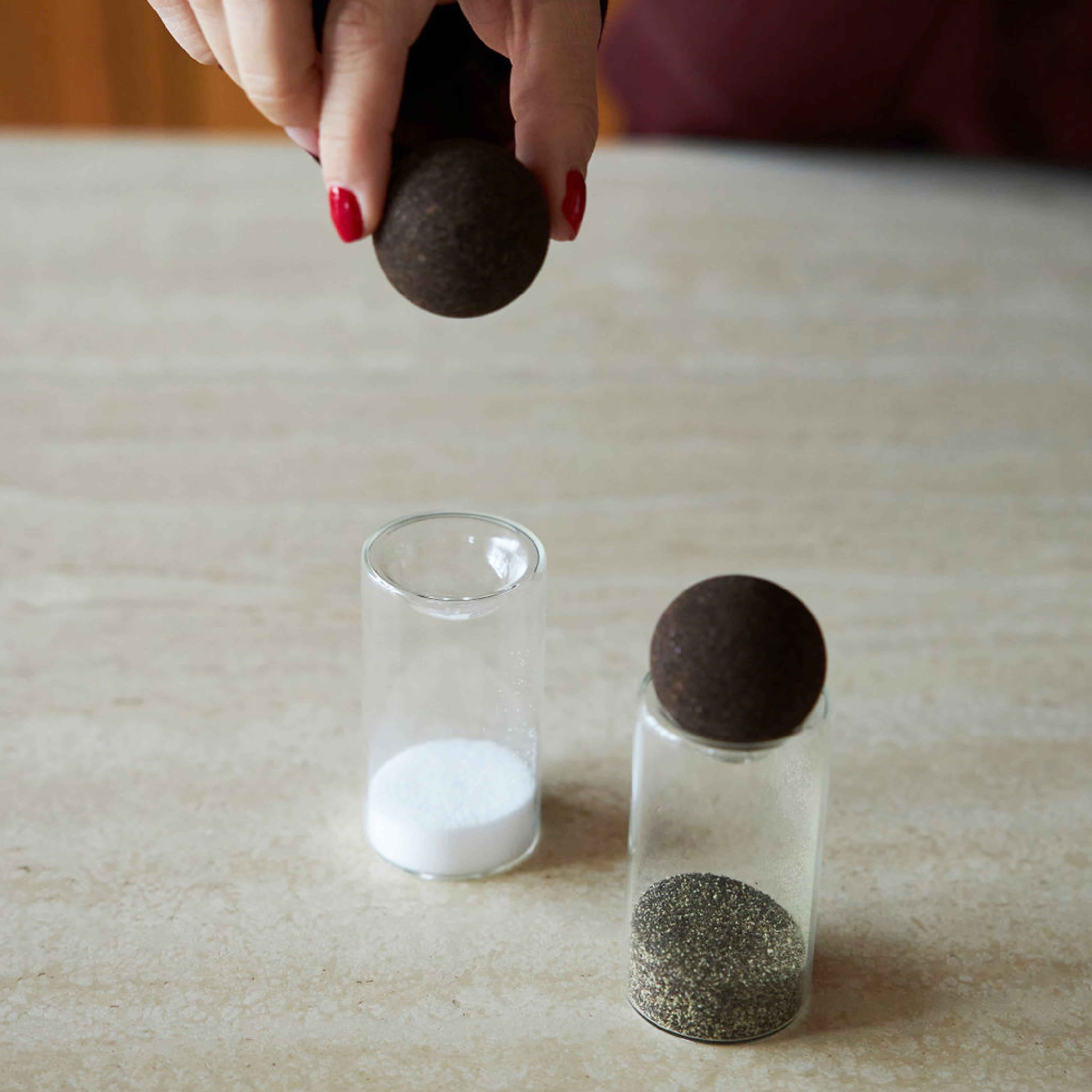 Kleine Glasgefäße für Salz und Pfeffer mit einem dunklen Korkball. Eine hübsche und klassische Kombination, die nie aus der Mode kommt. Diese Gläser bewahren Salz und Pfeffer auf natürliche Weise auf und sind ein Zeichen für eine bewusste Entscheidung. Wir lieben Kork, das haltbarste aller organischen Materialien. Außerdem ist er völlig flüssigkeitsdicht. Salz- und Pfeffergläser, die Sie immer in Sichtweite haben wollen. Wird im 2er-Pack geliefert.