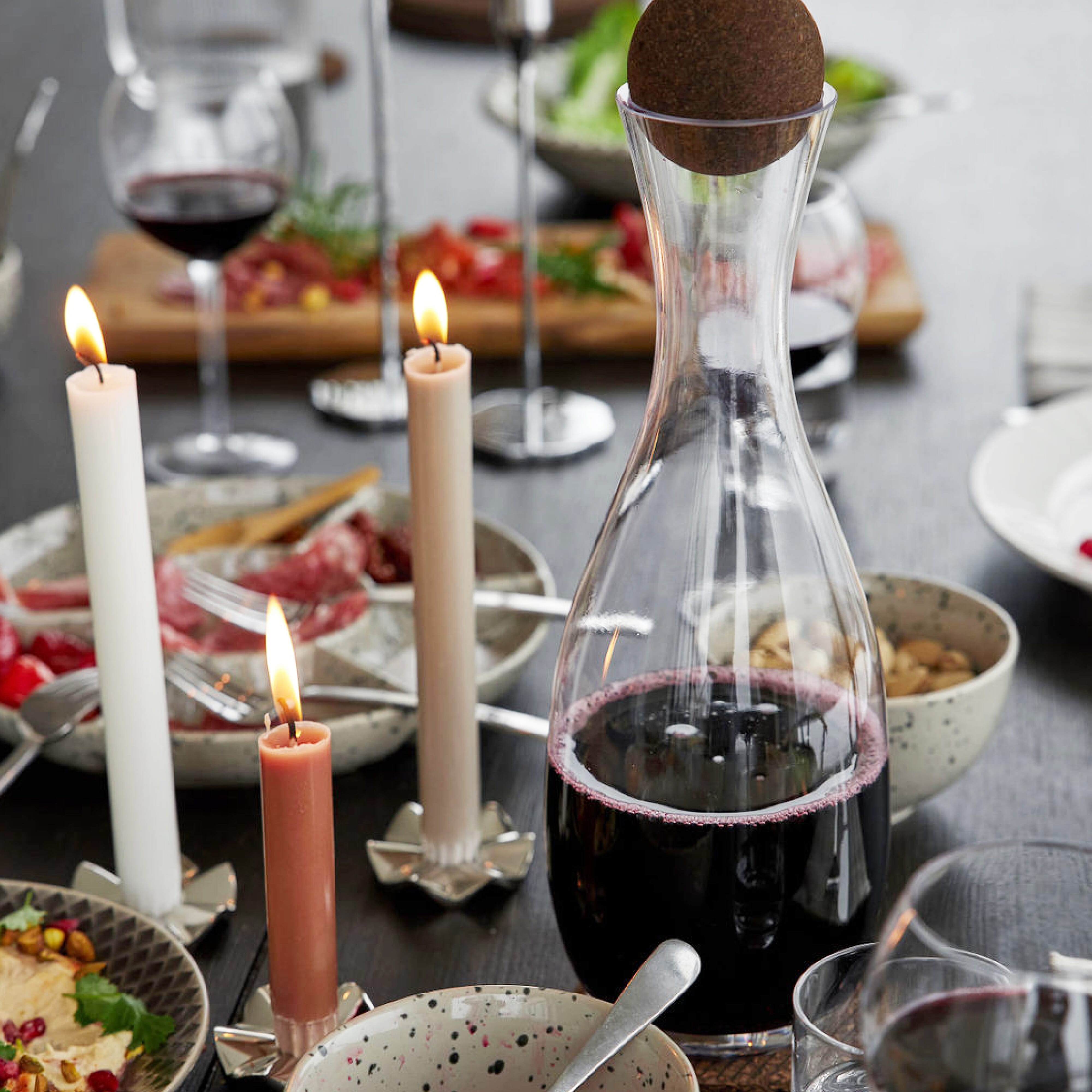 Die Weinkaraffe Nature mit Korkdeckel verbindet Beständigkeit, fließende Formen und Geheimnis. Die dunkelbraune Korkkugel verleiht Charakter und erinnert uns an Flaschen, die mit schönen kleinen Botschaften über den Meeresgrund gereist sind. In der Gegenwart steht die braune Farbe für Luxus und die Beständigkeit von Kork. Die Form des Dekanters ist gewellt und harmoniert mit der Saga-Glasserie.