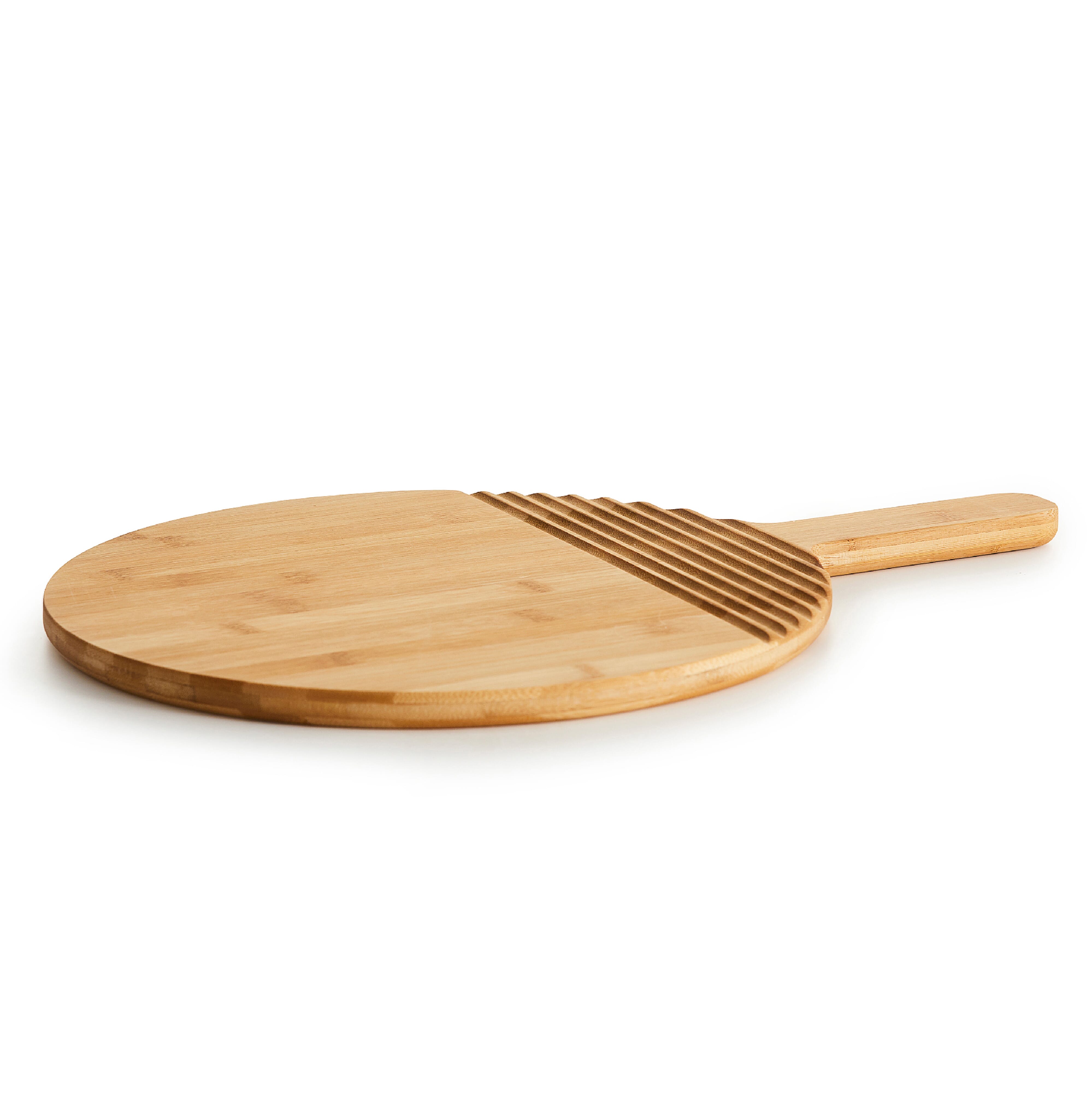 Großzügiges, rundes Schneidebrett aus Bambus, entworfen von Anton Björsing. Zu den gut durchdachten Details gehören ein stabiler Griff zum Servieren und Rillen, die optischen Stil mit Funktion verbinden und Platz für Utensilien bieten, damit diese nicht zu leicht abrutschen. Bambus ist ein schnell nachwachsender und erneuerbarer Rohstoff mit mehreren Vorteilen. Er ist robust und von Natur aus antibakteriell. Der Bambusanbau verbraucht wenig Wasser und kommt ohne Pestizide und Düngemittel aus.