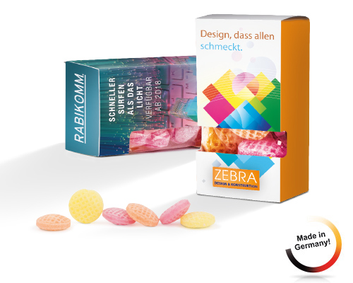 Produkt: PET-Dose, farblos-transparent mit Alu-Aufreißdeckel, auffälligem Werbe-Sleeve (rundum) aus transparenter Folie, individuell bedruckt und zusätzlichem Kunststoffdeckel zum Wiederverschließen br>Inhalt: Ungewickelte Bonbons in Nostalgieform, ca. 125 g br>Haltbarkeit: 24 Monate. br>Preise: € / Stück inkl. 4-c Digitaldruck auf Sleeve zzgl. Drucknebenkosten.