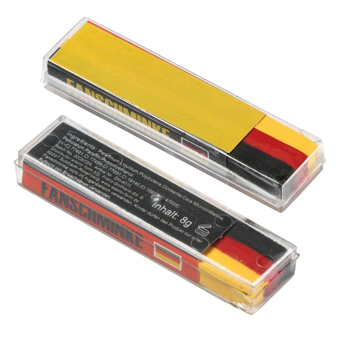 So gelingt die perfekte Deutschlandfahne im Nu! Praktische Fanschminke für eine einfache Anwendung: Ansetzen, Aufzeichnen – Fertig! Hautverträglich und rückstandslos abwaschbar.