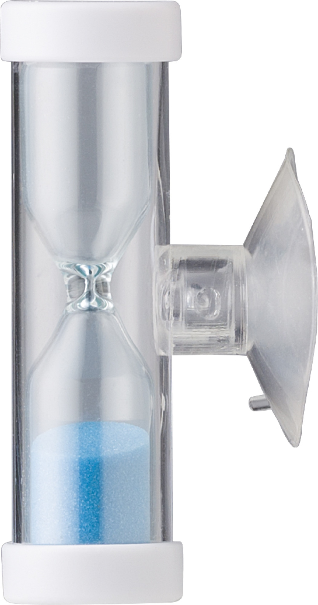 Kleine Sanduhr aus Glas mit ABS-Endstücken und Saugfuß. Ca. 3 Minuten. Einzeln verpackt im Polybeutel.