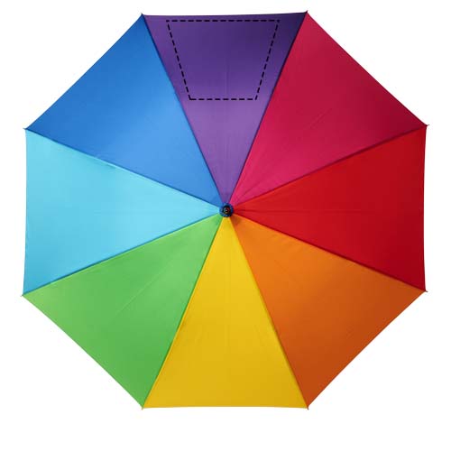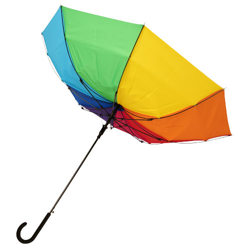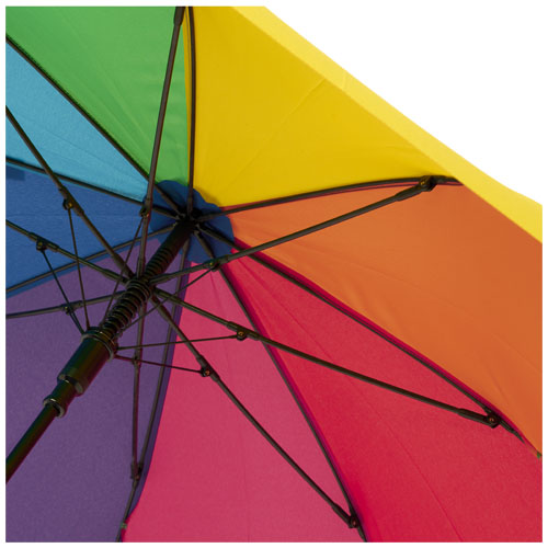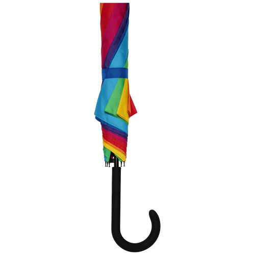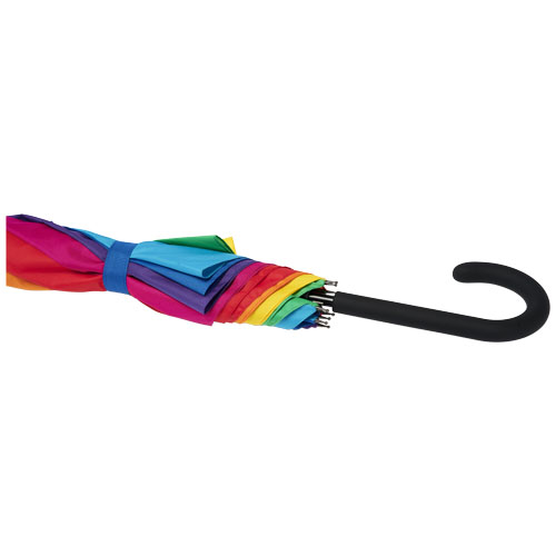 Automatikregenschirm mit regenbogenfarbenem Pongee-Polyesterschirm. Robuster Metallschaft, hochwertiger Vollglasrahmen mit maximaler Flexibilität bei Wind. Weicher, gebogener Griff und vernickelte Spitzen und Oberseite. Große Dekorationsfläche auf jedem Paneel möglich, die verschiedene kreative Logolösungen bietet.