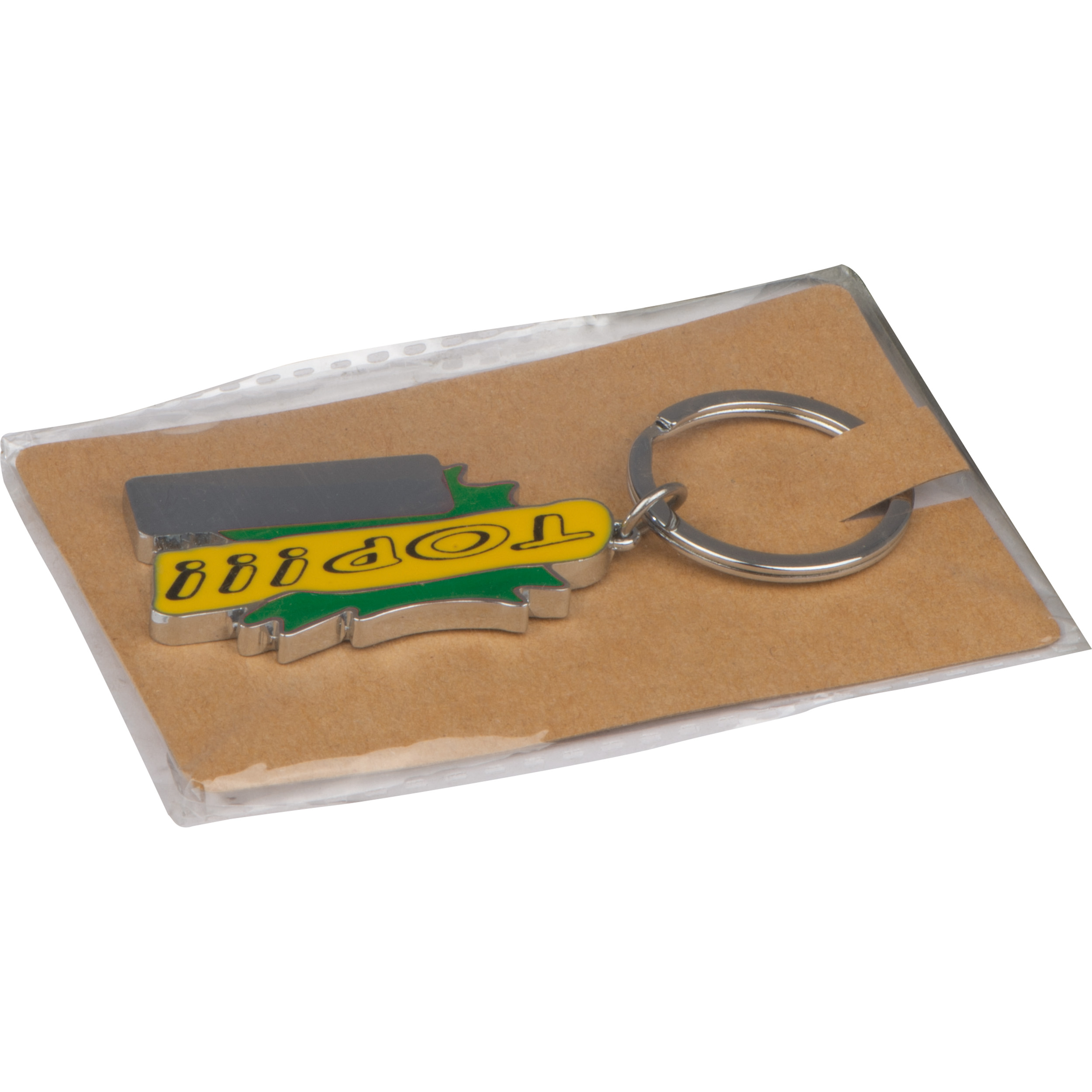 Schlüsselanhänger aus Metall mit farblich lackierter Vorderseite. Ihre Werbung wird auf das dafür vorgesehene Feld gelasert.