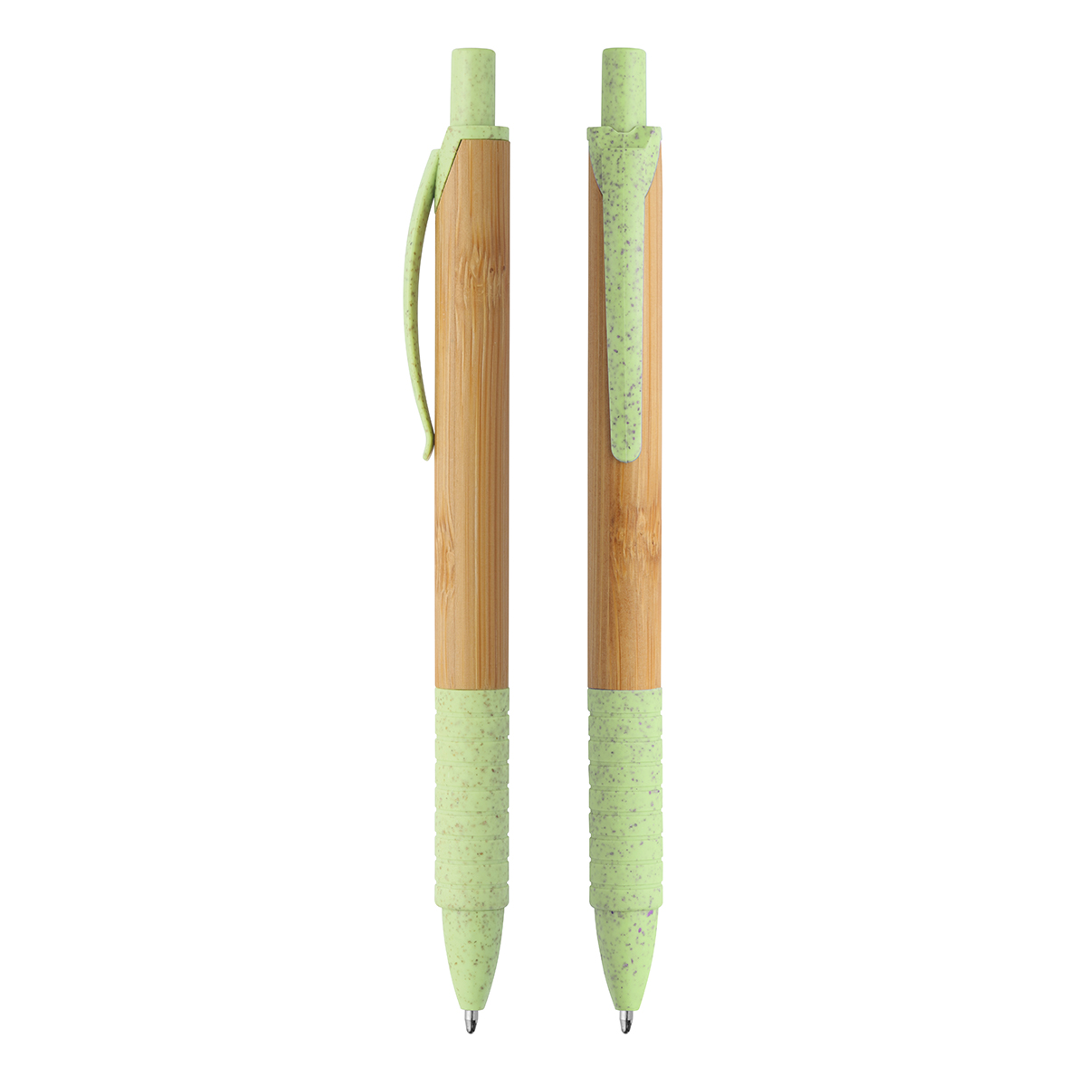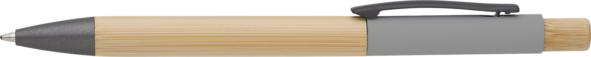 Kugelschreiber mit Klickmechanismus, mit einem Schaft aus Bambus, akzentuiert durch einen verchromten Clip und Verzierungen aus ABS-Kunststoff. Die Farbe des Bambusmaterials kann variieren.
