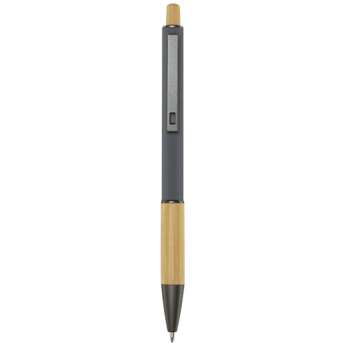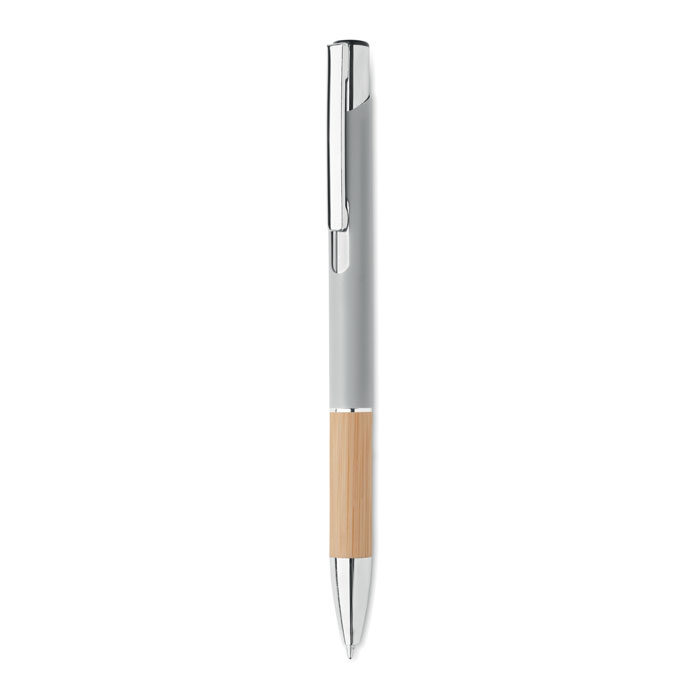 Der Darius Kugelschreiber wird aus recyceltem Aluminium hergestellt, was weniger Energie benötigt als die Herstellung von Aluminium aus Rohstoffen. Es reduziert außerdem die Abfallmenge auf Mülldeponien und trägt dazu bei, natürliche Ressourcen zu schonen und Treibhausgasemissionen zu reduzieren. Der Druckknopf und der untere Teil des Schafts sind aus Bambus gefertigt. Tintenfarbe: Blau. Schreiblänge: 800 Meter. Spitzengröße: 1,00 mm.