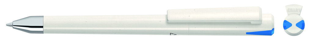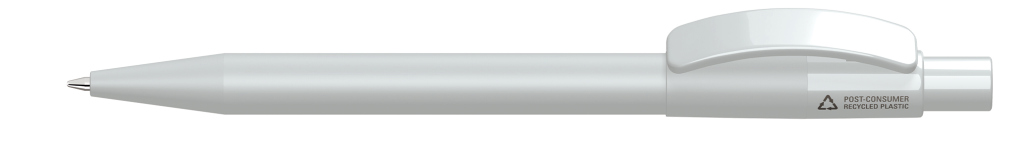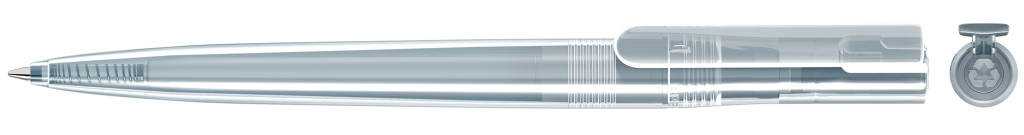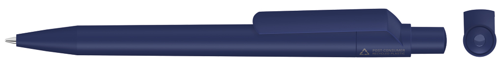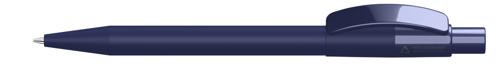 WoW!c Blauschreibender Kugelschreiber, hergestellt aus 85% Post-Consumer-recyceltem ABS aus Haushaltsgeräten. Der Altkunststoff wird sortiert und zu verwertbarem Schrott als neuem Rohstoff verarbeitet. Auf diese Weise werden etwa 70% des Energieverbrauchs im Vergleich zur herkömmlichen Produktion von neuem Kunststoff eingespart. Außerdem trägt es zur Verringerung der Müllberge bei. Der Stift ist standardmäßig mit dem Recycling-Symbol bedruckt.