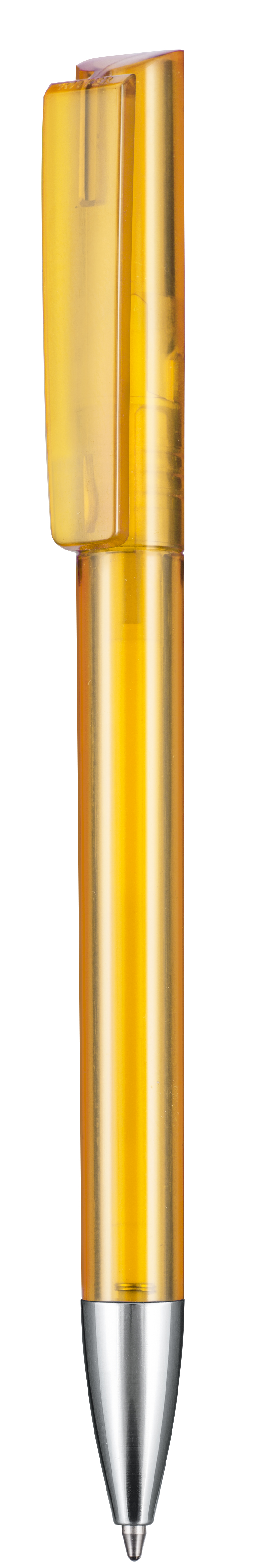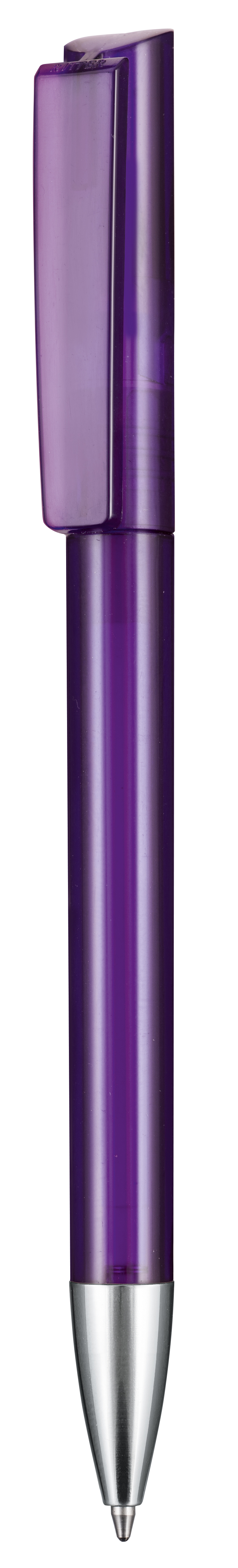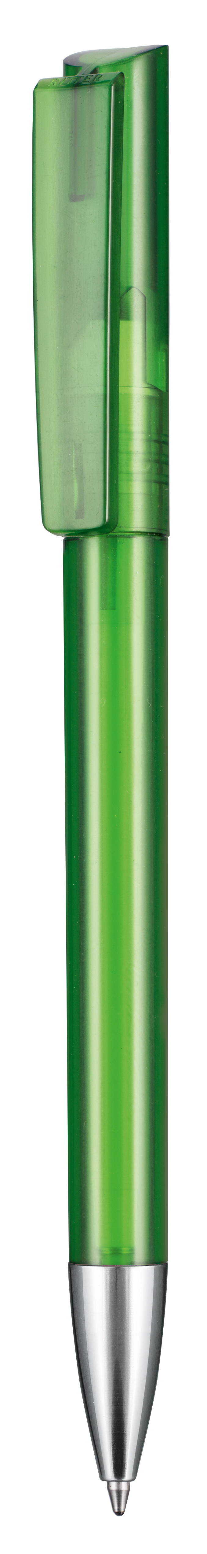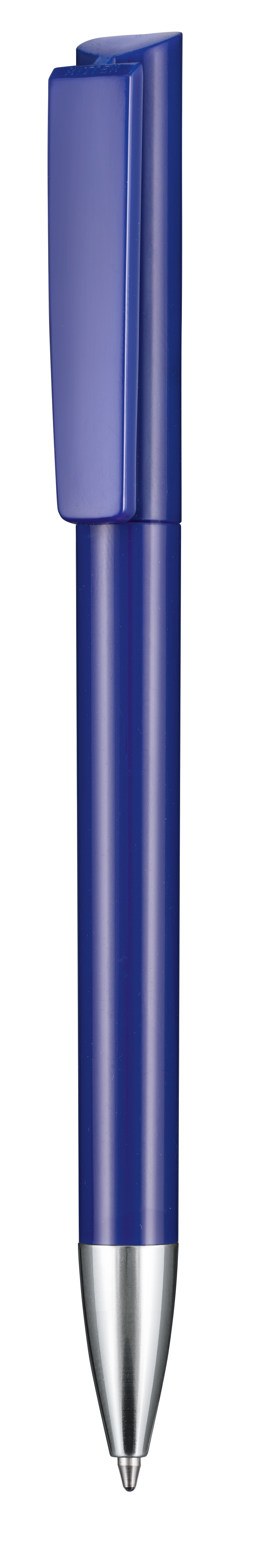 Kugelschreiber mit Drehmechanik und angespritztem Clip. Glänzende Oberflächen, transparentes Gehäuse und Metallspitze vermitteln Wertigkeit. Gutes Preis-Leistungsverhältnis. Ausgestattet ist dieses Schreibgerät mit einer blau schreibenden Budget-Großraummine.