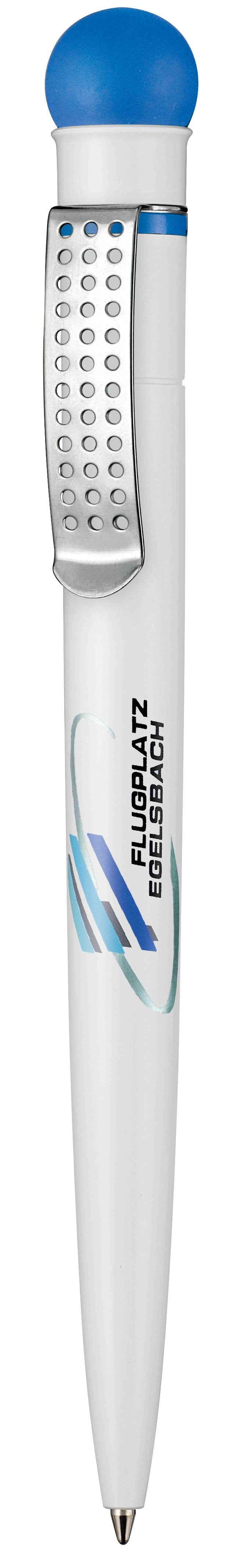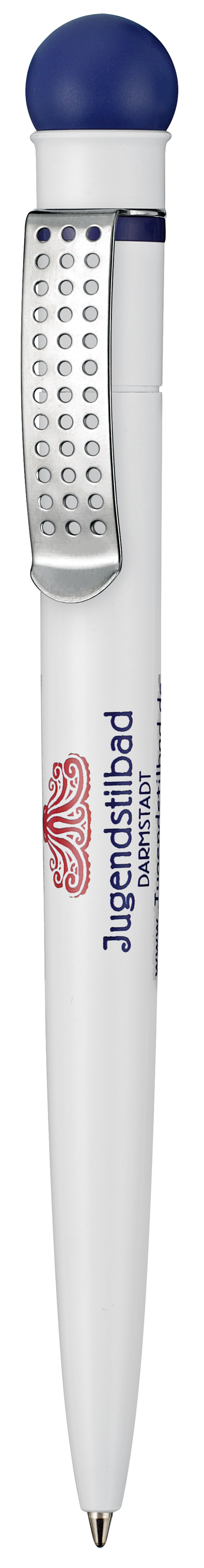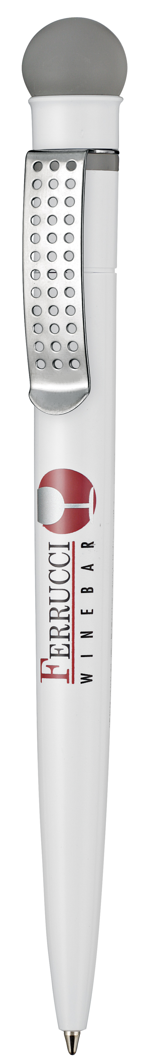 Einzigartiges Design. Dieser in Deutschland gefertigte Druckkugelschreiber verfügt über einen flexiblen Gummiballdrücker. Außerdem ist er mit einem äußerst stabilen und wertigen Edelstahlclip im Lochdesign ausgestattet. Der Schaft bietet eine große, ununterbrochene Werbefläche. Für ein stets einwandfreies Schriftbild sorgt eine Qualitätsmine Jogger.