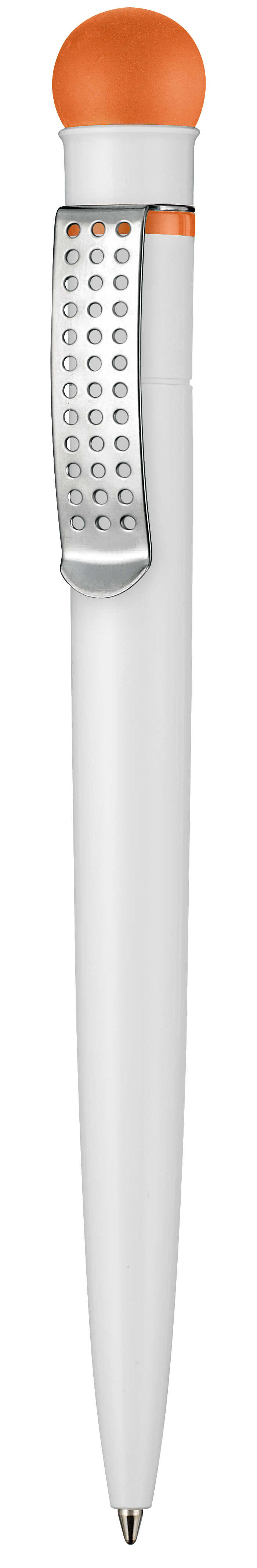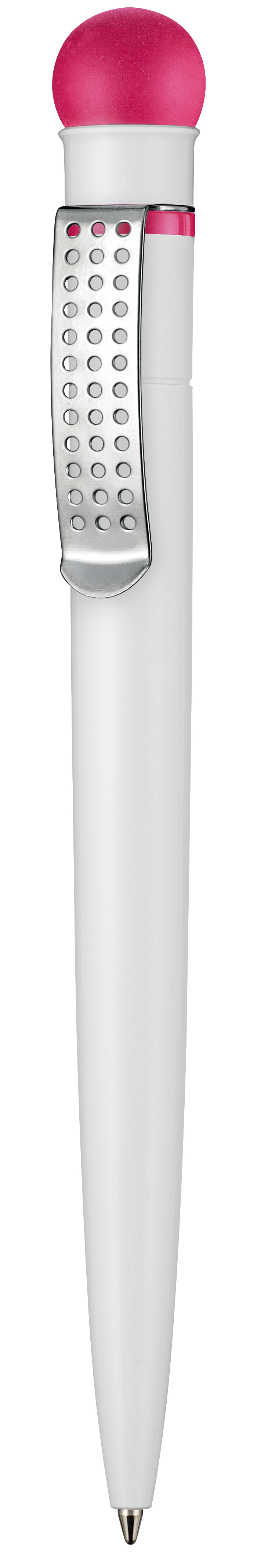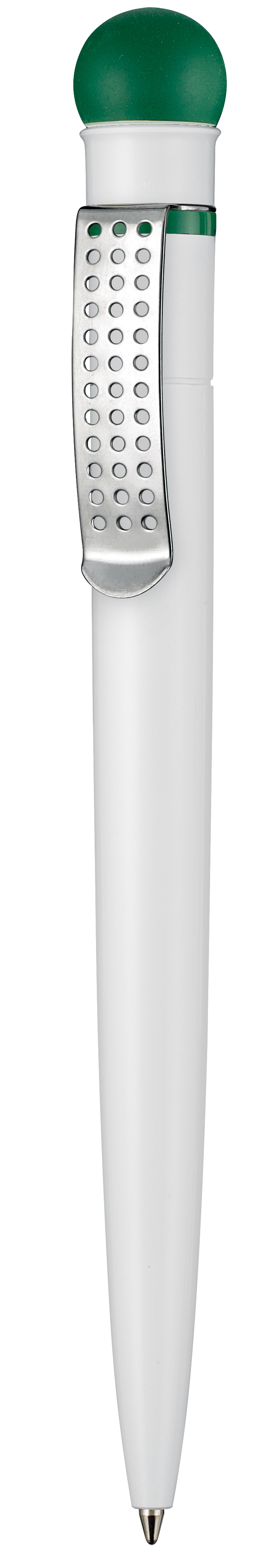 Einzigartiges Design. Dieser in Deutschland gefertigte Druckkugelschreiber verfügt über einen flexiblen Gummiballdrücker. Außerdem ist er mit einem äußerst stabilen und wertigen Edelstahlclip im Lochdesign ausgestattet. Der Schaft bietet eine große, ununterbrochene Werbefläche. Für ein stets einwandfreies Schriftbild sorgt eine Qualitätsmine Jogger.