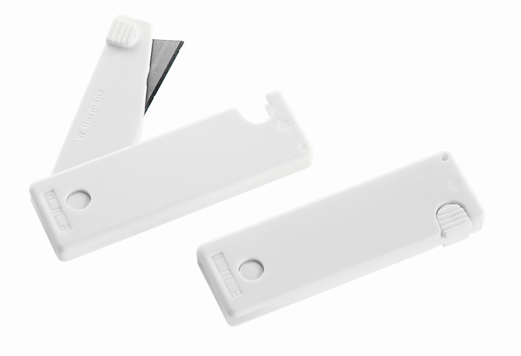 Aufklappbares Kartonmesser in weiß. Weitere Farben auf Anfrage.