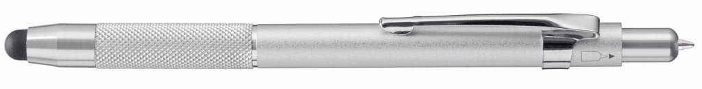 Metallkugelschreiber aus Aluminium mit gummiertem Spitze für die Touchscreensteuerung und integrierter Kugelschreibermine im Drücker, welches sich durch einfaches Umdrehen des Kugelschreibers in Schreibstellung bringt. Gehäuse in silber.