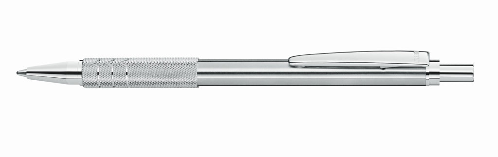 Metall-Druckbleistift (0,7 mm) aus Edelstahl mit glänzend verchromten Beschlägen und Griffzone.
