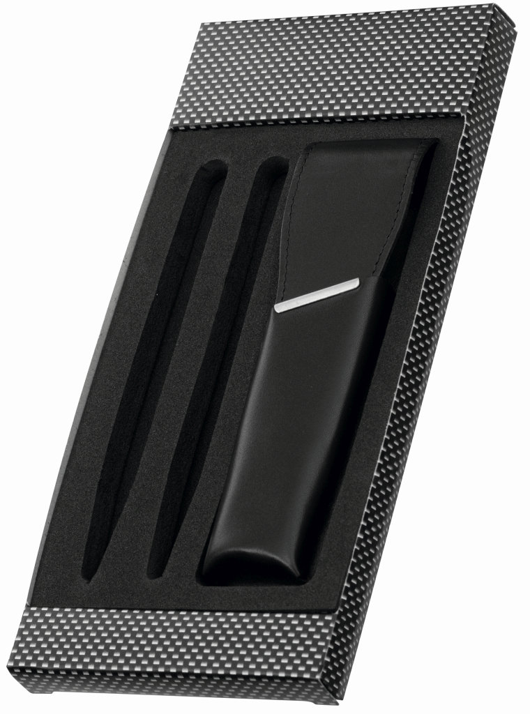 Geschenkverpackung im Carbon-Look mit transparentem Schuber für zwei Kugelschreiber inklusive Lederetui.