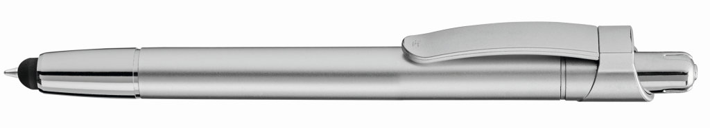 Druckkugelschreiber mit gummierter Spitze für die Touchscreensteuerung und integrierter Kugelschreibermine. Das Gehäuse ist silber matt, Spitze und Drücker in silber glänzend.