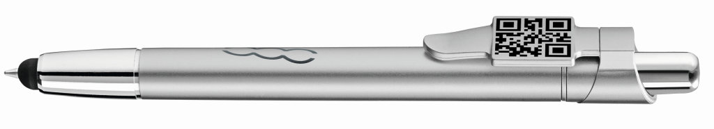 Druckkugelschreiber quadratischem Clip für QR-Code-Bedruckung, mit gummierter Spitze für die Touchscreensteuerung und integrierter Kugelschreibermine. Das Gehäuse ist silber matt, Spitze und Drücker in silber glänzend.
