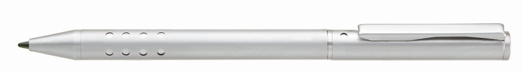 Metall-Drehkugelschreiber mit matt verchromtem Gehäuse. Mit einer schwarz schreibenden Mine und Touch-Mine.