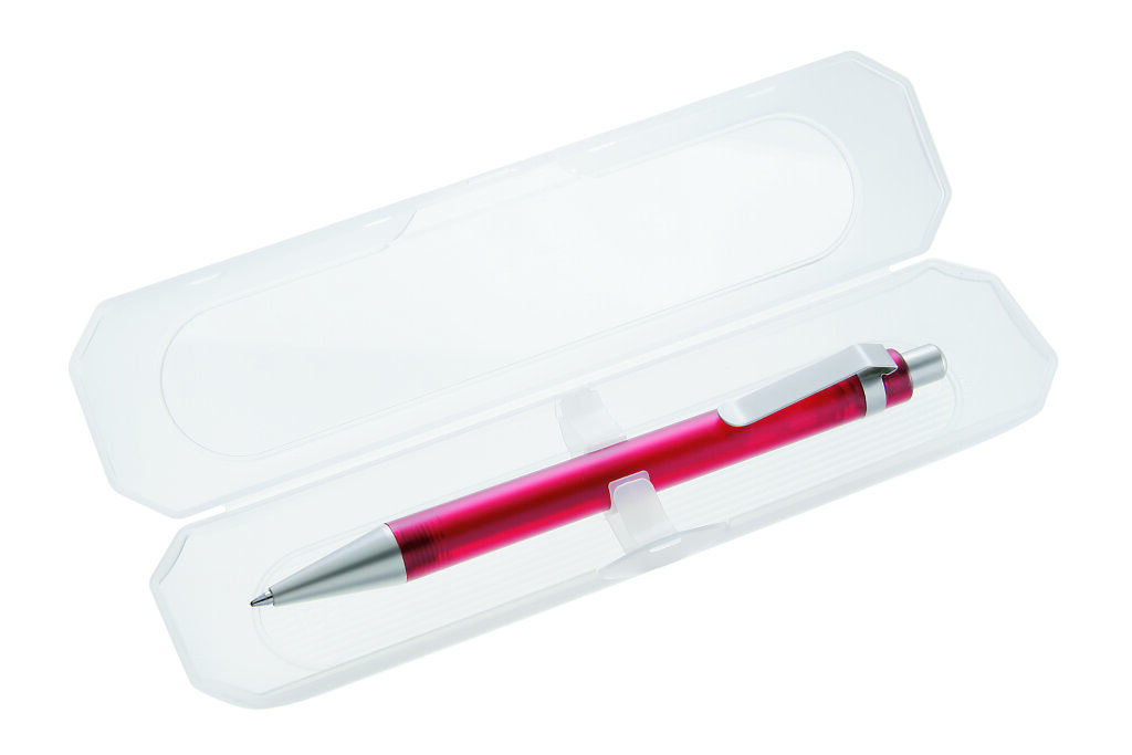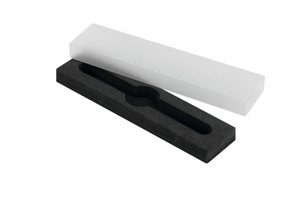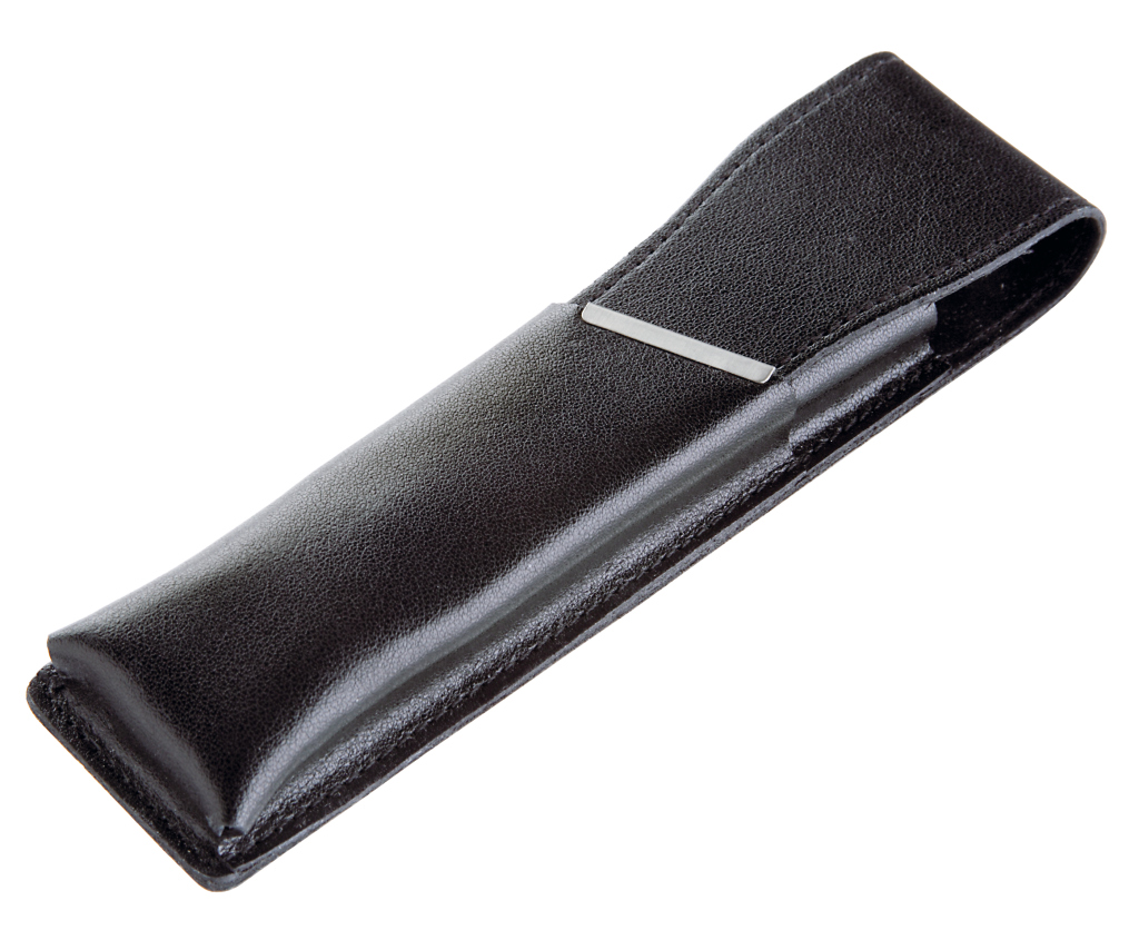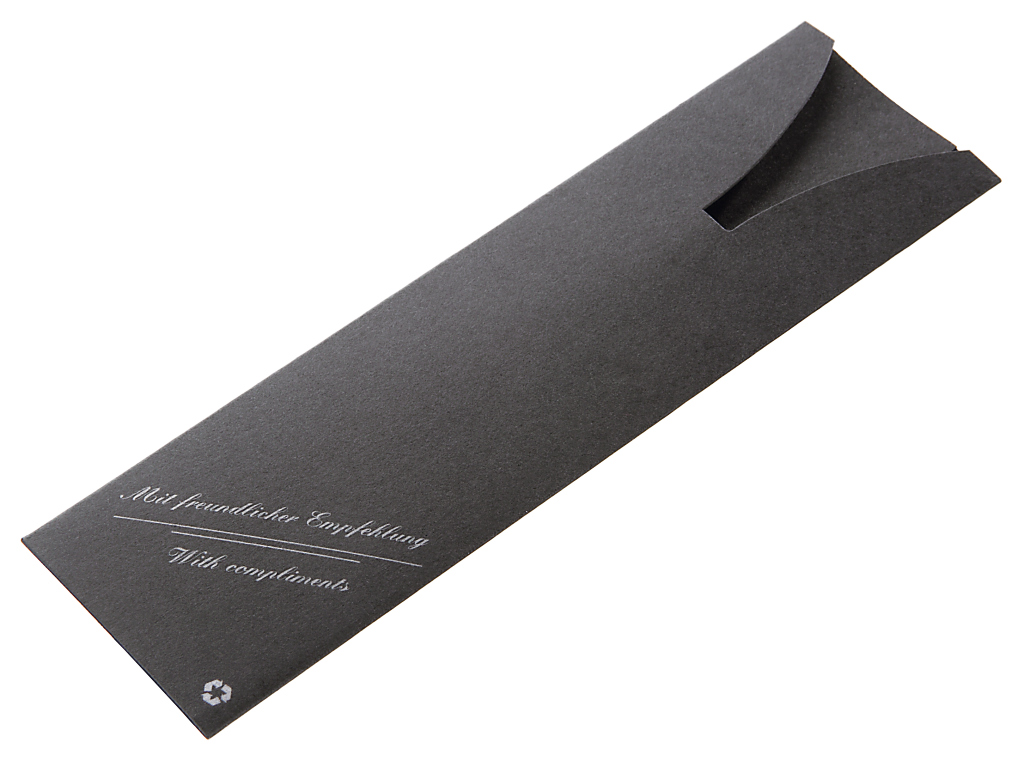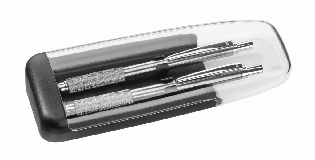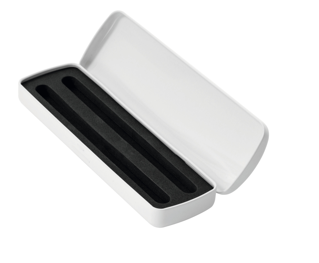 Kunststoff-Etui mit transparentem Deckel und schwarzem Boden. Incl. beidseitig bedrucktem Einleger für 2 Schreibgeräte.